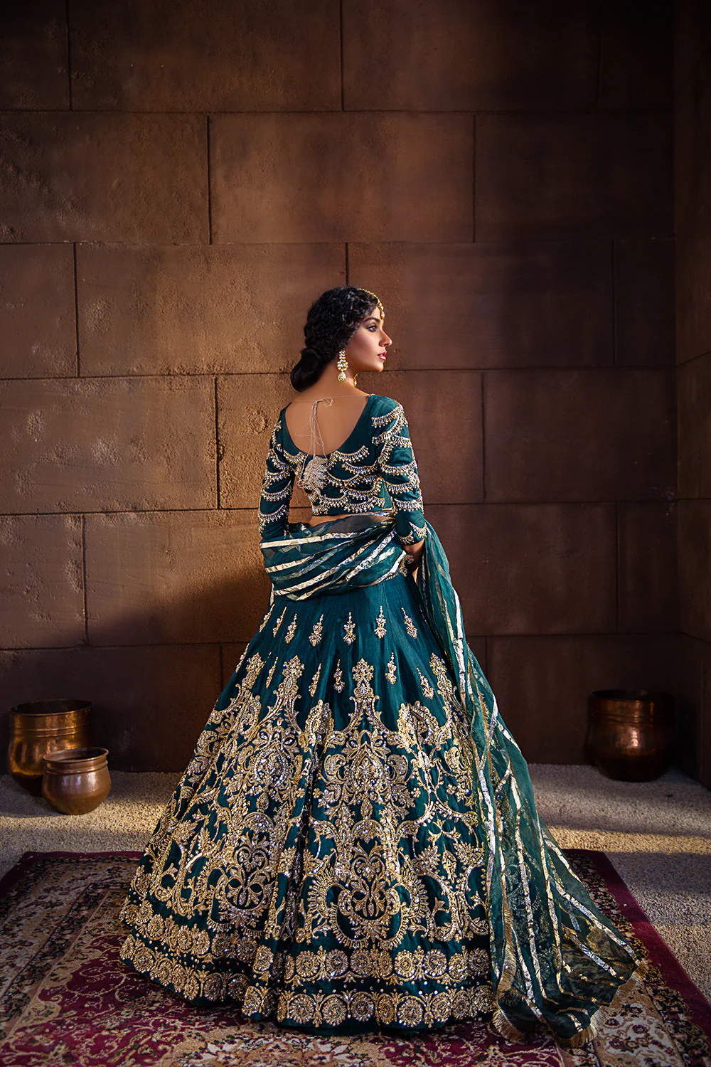 A stunning dark green bridal lehenga choli set in Korean raw silk, featuring intricate gold sequins, gotta, dabka, kora, and kiran embellishments, paired with a hand-finished organza dupatta for a sophisticated and regal bridal look.