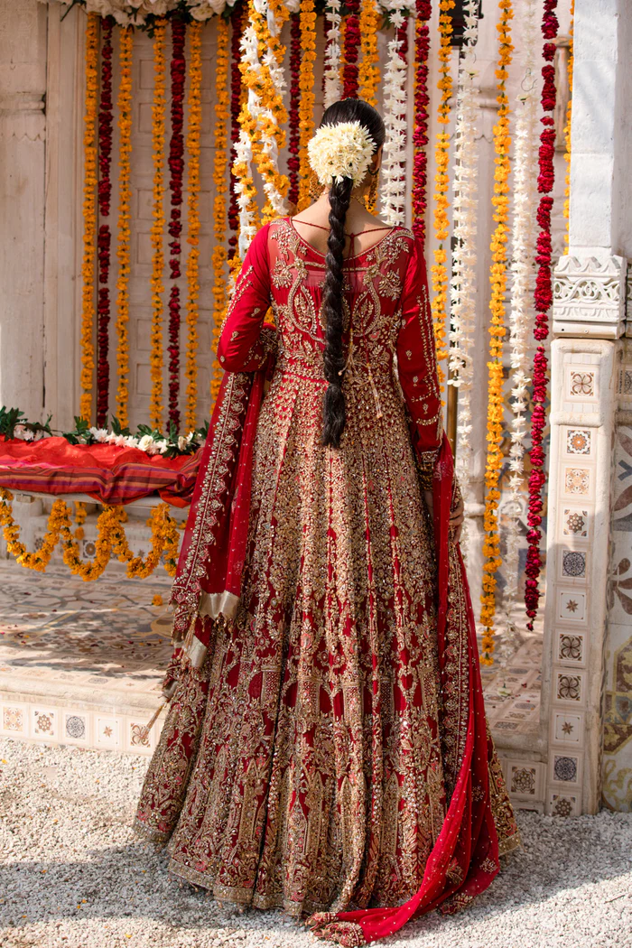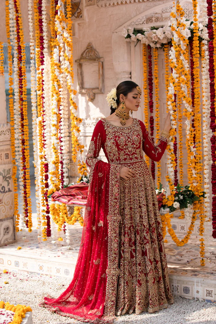 A regal deep red lehenga by Goldenzari By Shujat, featuring intricate Baroque-inspired embroidery, golden appliqué detailing, and an embellished chiffon dupatta for timeless bridal and formal elegance.