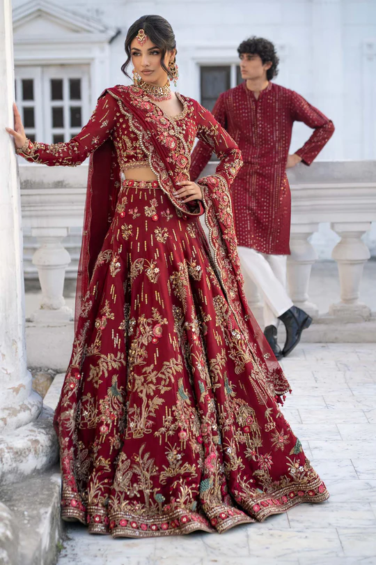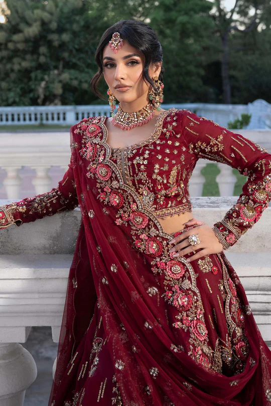 A deep red organza lehenga set featuring handcrafted mirror work, naqshi, sequins, 3D floral motifs, and pearls, blending traditional elegance with regal modern detailing.