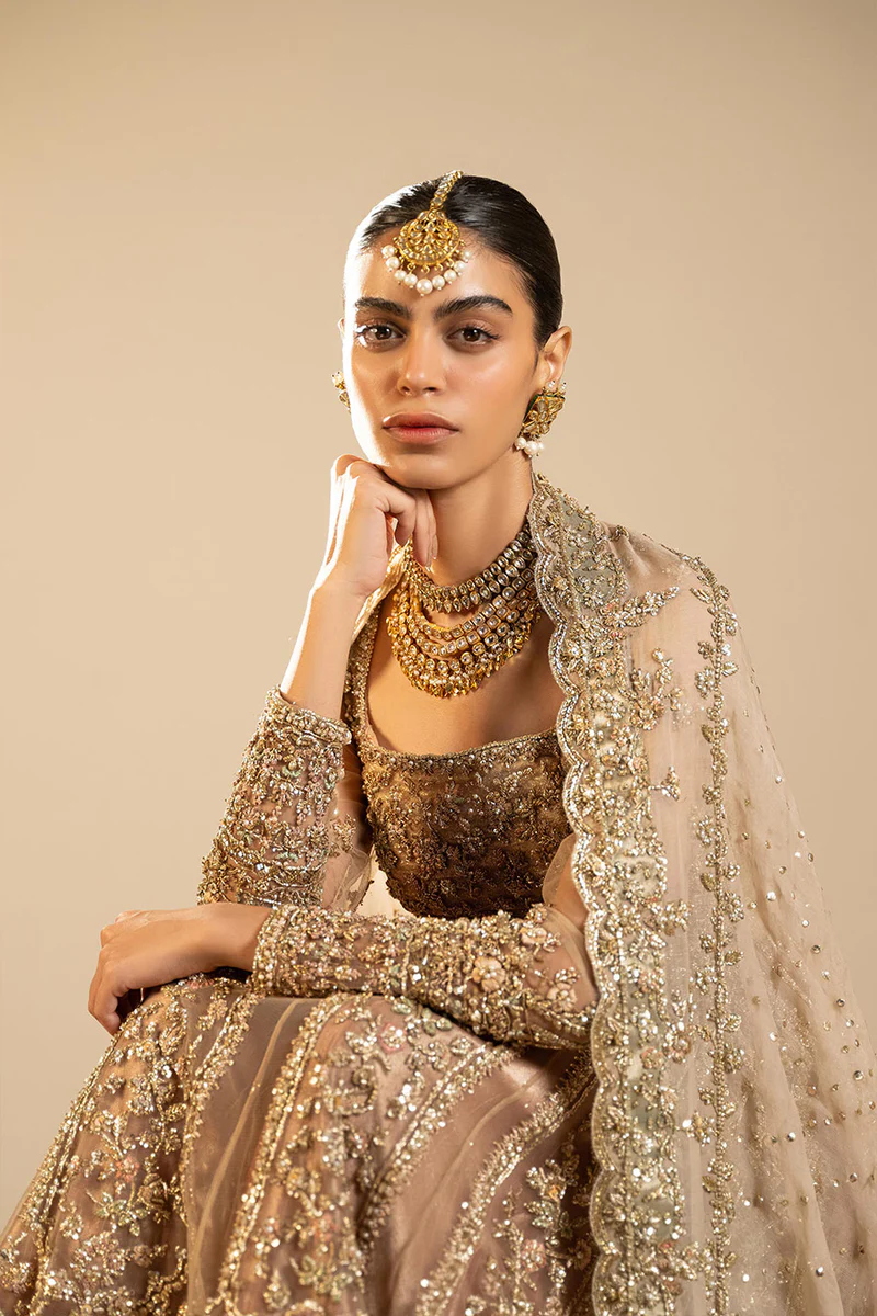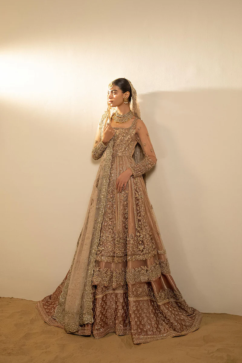 The pishwas is crafted in delicate dusty pink net, designed in a flowing, elongated silhouette that exudes elegance and movement. It is lavishly adorned with intricate zardozi, mokaish, sequin, pearl, and pastel thread embroidery, creating a luminous yet soft bridal aesthetic. Fine hand embellishment is evenly distributed across the bodice and flare, adding depth and richness without overpowering the pastel tone. A smooth satin lining beneath ensures comfort and graceful structure throughout wear.