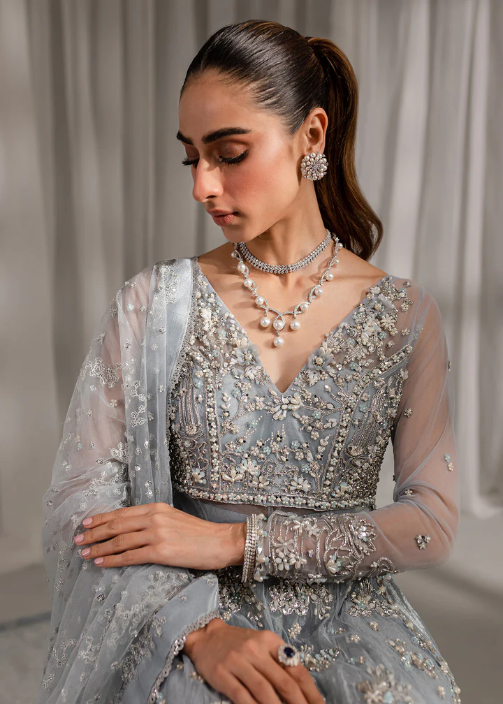 The net dupatta complements the ensemble with delicate embroidery, sequins, and silverwork. Its light and airy texture enhances the overall elegance of the sharara kameez, completing a sophisticated and captivating bridal look.