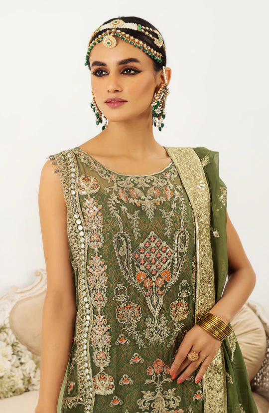 A stunning Pakistani wedding ensemble featuring a premium green chiffon kameez with intricate embroidery, paired with a lavish sharara and a delicate embroidered dupatta. Perfect for Mehndi, wedding functions, or festive occasions.