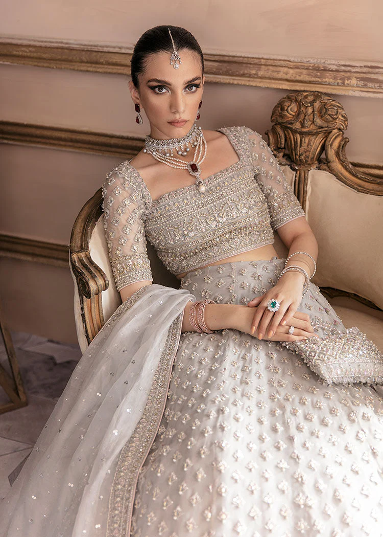 Step into timeless elegance with this exquisite grey organza bridal ensemble, featuring a hand-embellished choli, a flowing lehenga with silverwork and crystals, and a delicately adorned organza dupatta—perfect for a sophisticated bridal look.