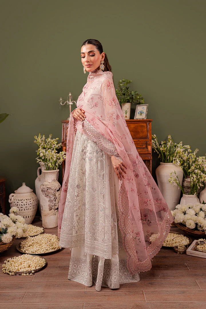 The outfit is completed with a delicate organza dupatta, fully adorned with fine embroidery, thread work, and elegant detailing. The dupatta adds a soft, flowing dimension to the ensemble, perfectly harmonizing with the frock and trousers for a timeless, festive look.