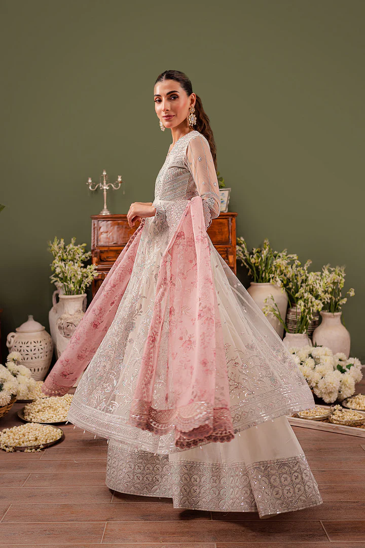 This luxurious Pishwas frock in an enchanting off-white shade is crafted from premium net fabric. The elongated coat-style top features exquisite hand-embellishments including embroidery, Dabka, Tilla, and sequins, creating a regal and sophisticated look. Lavish floral motifs and intricate patterns enhance the elegance of this frock, making it a standout choice for wedding festivities and formal occasions.