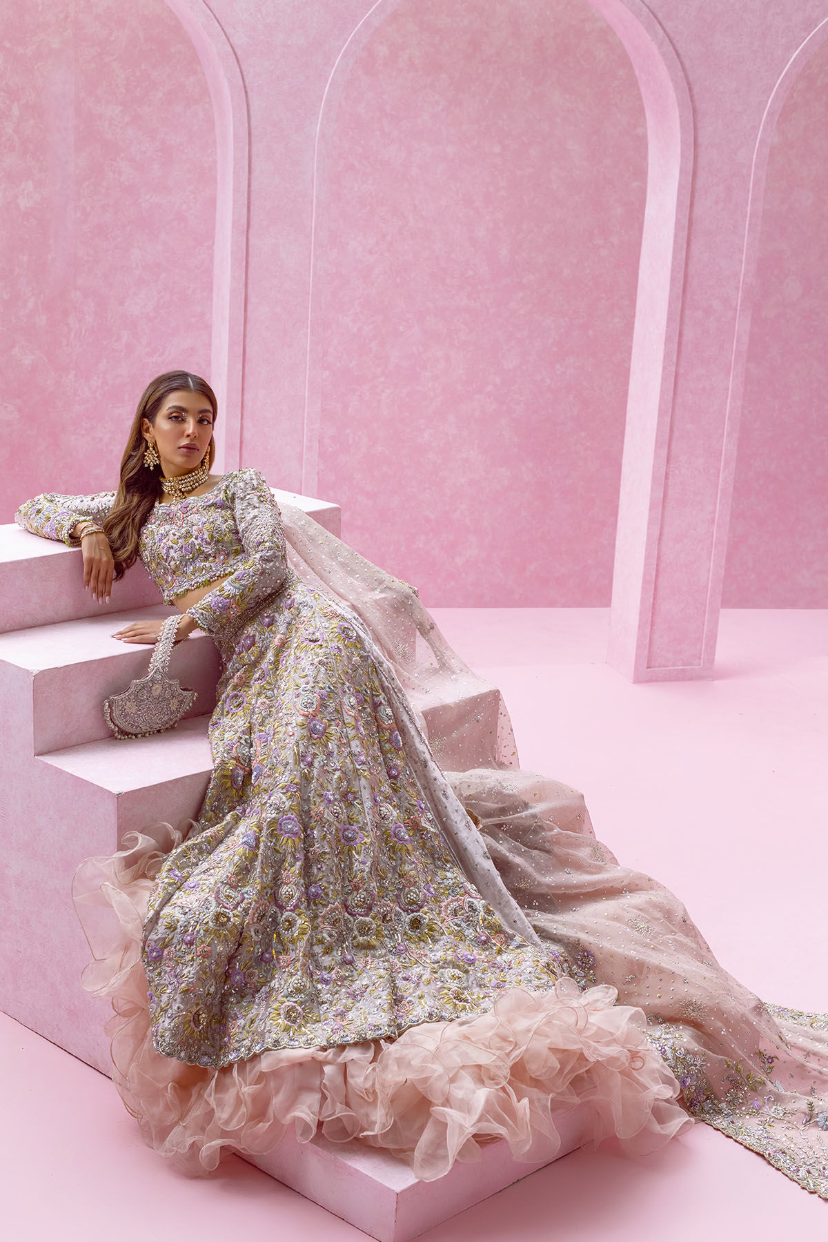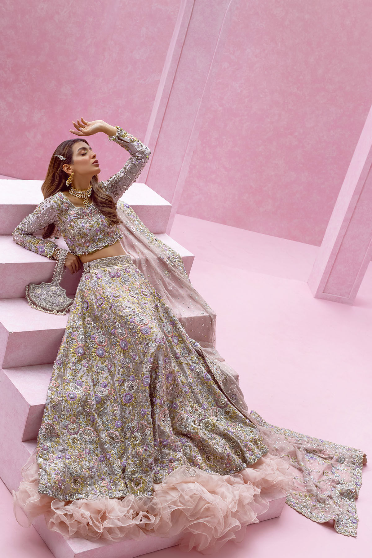 The lehnga is a true statement piece, composed on a matching nude gold canvas. Symmetrical floral patterns bloom across the surface in soft pastel hues, enhanced with hand-applied zardozi and crystal embellishment. The balance of shimmer and color gives the lehnga depth, elegance, and graceful movement.