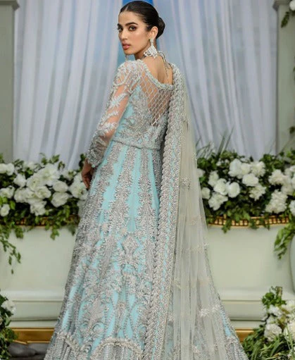 A regal Pakistani wedding ensemble featuring a soft pink embellished blouse, ice blue fish-cut lehenga, and a pearl and crystal-studded net dupatta, combining traditional craftsmanship with contemporary bridal elegance.