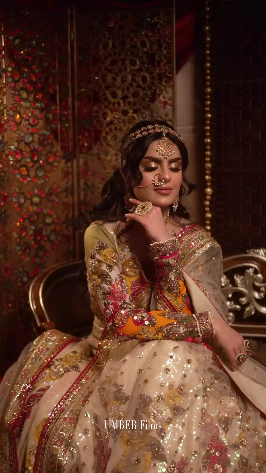 The outfit is accessorized with a breezy ivory net dupatta, sprinkled with golden sequins for subtle shimmer and finished with delicate trims on all sides. Its light texture and soft drape add movement and grace, perfectly balancing the richly embellished choli and lehnga.