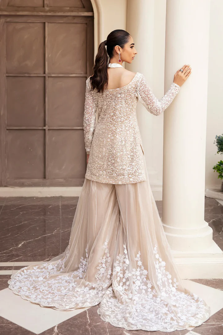 The embroidered kameez is paired with a lavish Pakistani sharara that completes the ensemble with dramatic flair. Designed with a generous, voluminous flare, the sharara is fully adorned with ornate goldwork, delicate ornaments, and intricate embroidery. Crafted from premium-quality organza, it offers a graceful flow and luxurious feel, making it an impeccable choice for wedding day wear and grand celebrations.