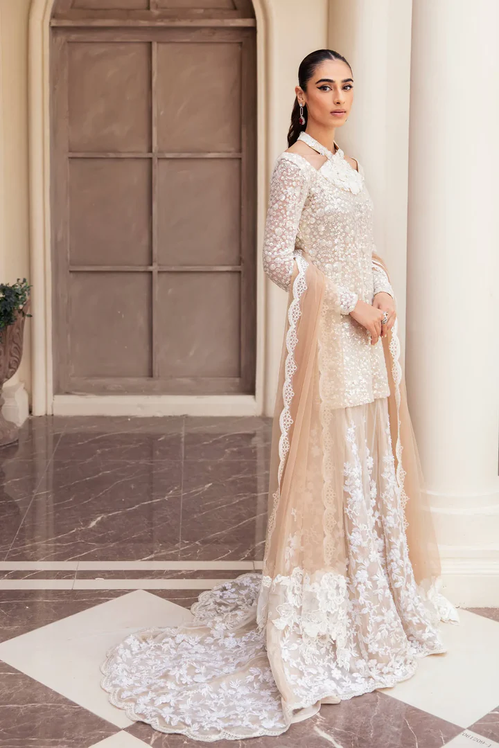 This divine embroidered kameez is designed to exude a fairy-tale aura through its graceful silhouette and luxurious handwork. Featuring a beautifully elongated cut with a flowing trail, the kameez is heavily adorned with intricate embroidery and detailed hand embellishment spread elegantly across the surface. The craftsmanship reflects refined artistry, creating depth and richness that elevate the overall look. Worn effortlessly, this mesmerizing piece embodies timeless bridal elegance and regal charm.