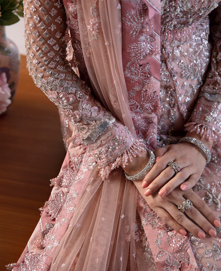 An enchanting pink bridal ensemble featuring a lavishly embroidered net pishwas paired with a voluminous raw silk lehenga and a delicately embellished dupatta for a refined Pakistani bridal look.