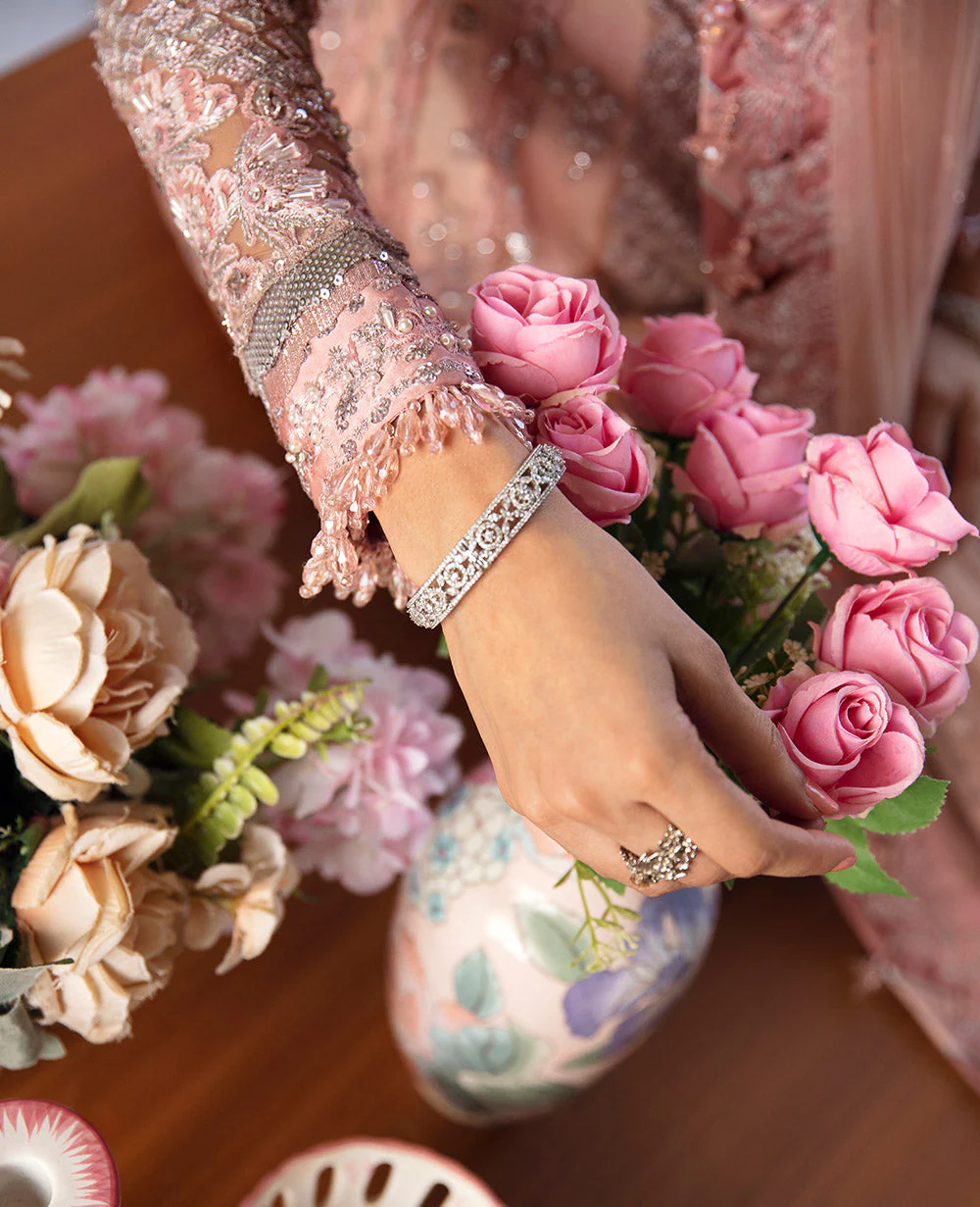 An elegant pink palette enhanced with silver and tilla embellishments.