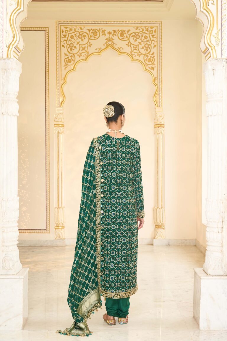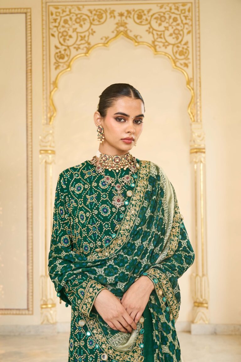 The long kurta is crafted in a rich green bandhani base, enhanced with refined handwork that includes mirror accents, cutdana detailing, and multi-toned thread artistry. Its structured silhouette maintains traditional grace while embracing a modern handcrafted elegance. Each embellishment is thoughtfully arranged to highlight the intricate texture of the bandhani pattern.