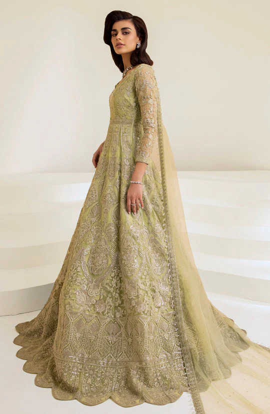 The pishwas frock is designed in an alluring green shade and tailored in a classic bridal silhouette that flows elegantly with every movement. Crafted in fine net fabric, it is lavishly adorned with intricate embroidery, shimmering sequins, and delicate motifs that add depth and glamour. The flawless stitching and graceful design create a dreamy, sophisticated look ideal for a Pakistani bridal ensemble.