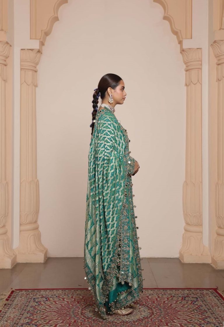A handcrafted green and rose-gold kurta set featuring intricate mirror and cutdana work, paired with a traditional bandhani dupatta for an effortlessly regal look.