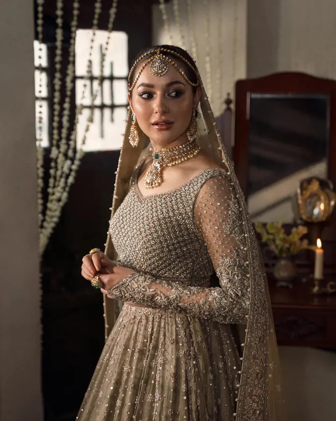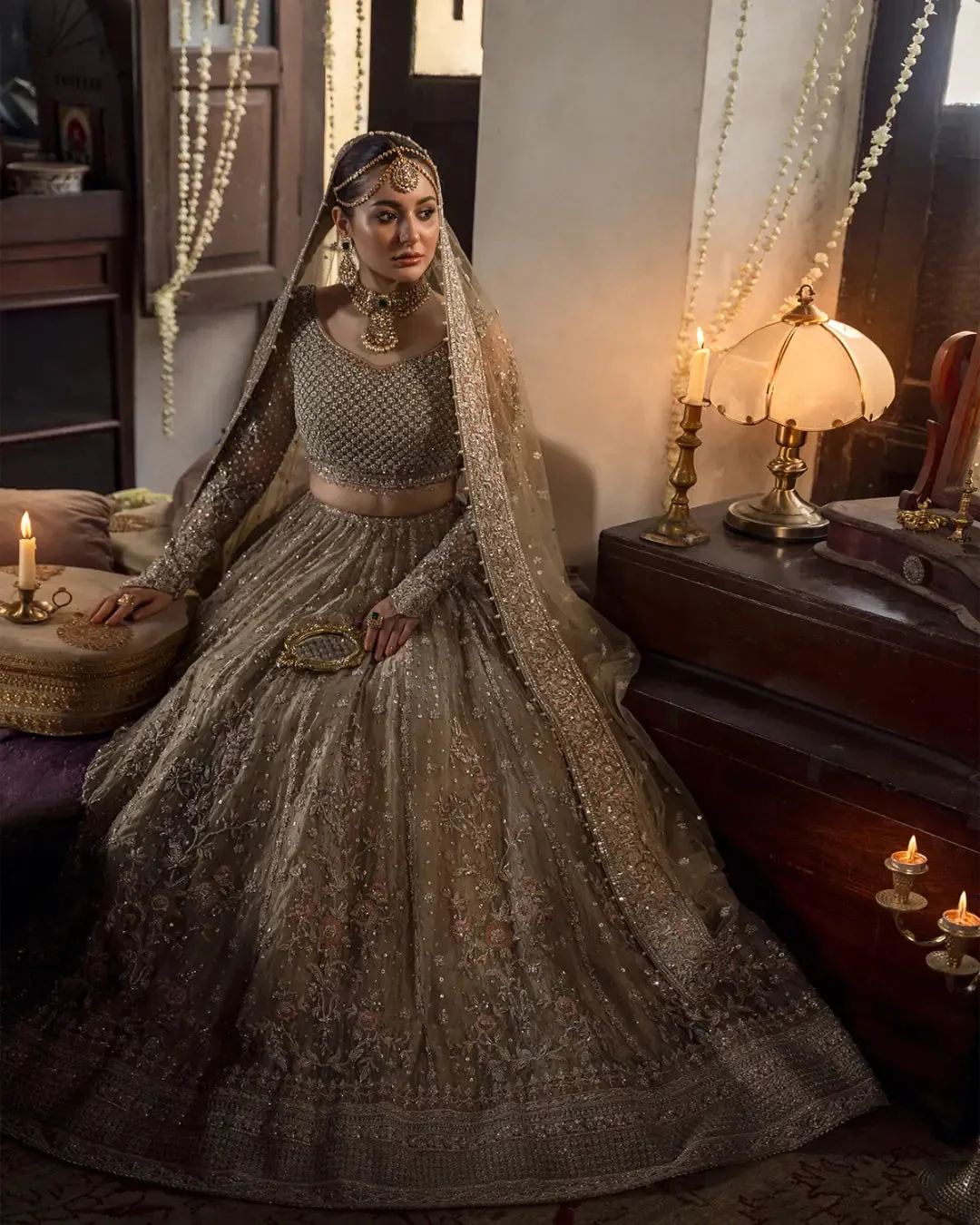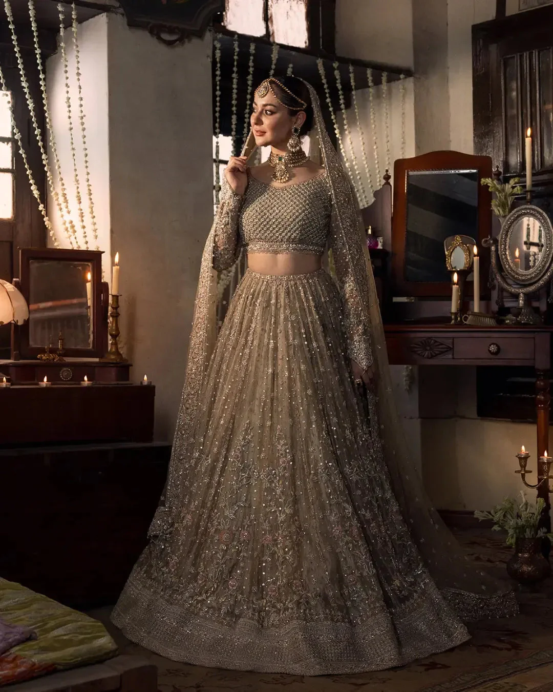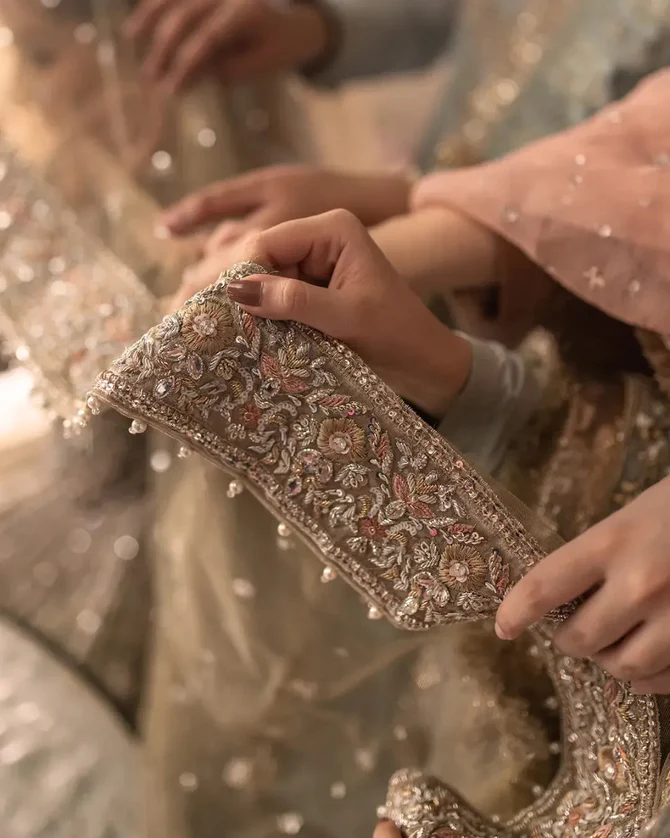 The ensemble is complemented by a delicate, translucent net dupatta. Its borders are meticulously embellished with sequins, silverwork, thread detailing, and beads. The soft drape of the dupatta, along with its intricate ornamentation, perfectly completes the bridal look, adding grace and sophistication to the overall ensemble.