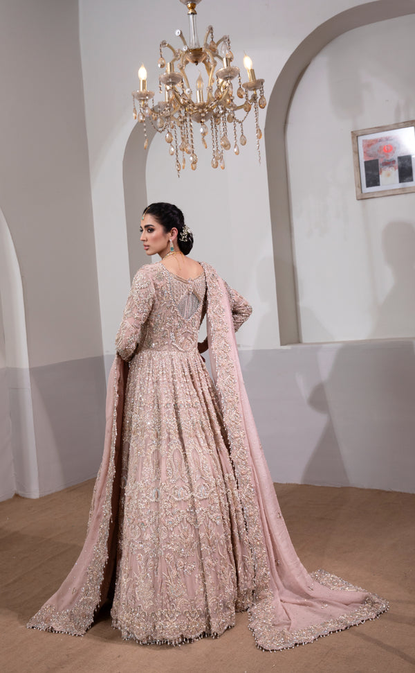 The dupatta completes the ensemble with its light, ethereal drape and thoughtfully embellished accents. Designed to frame the outfit beautifully, it carries subtle touches that elevate the bridal look while maintaining softness and harmony throughout.