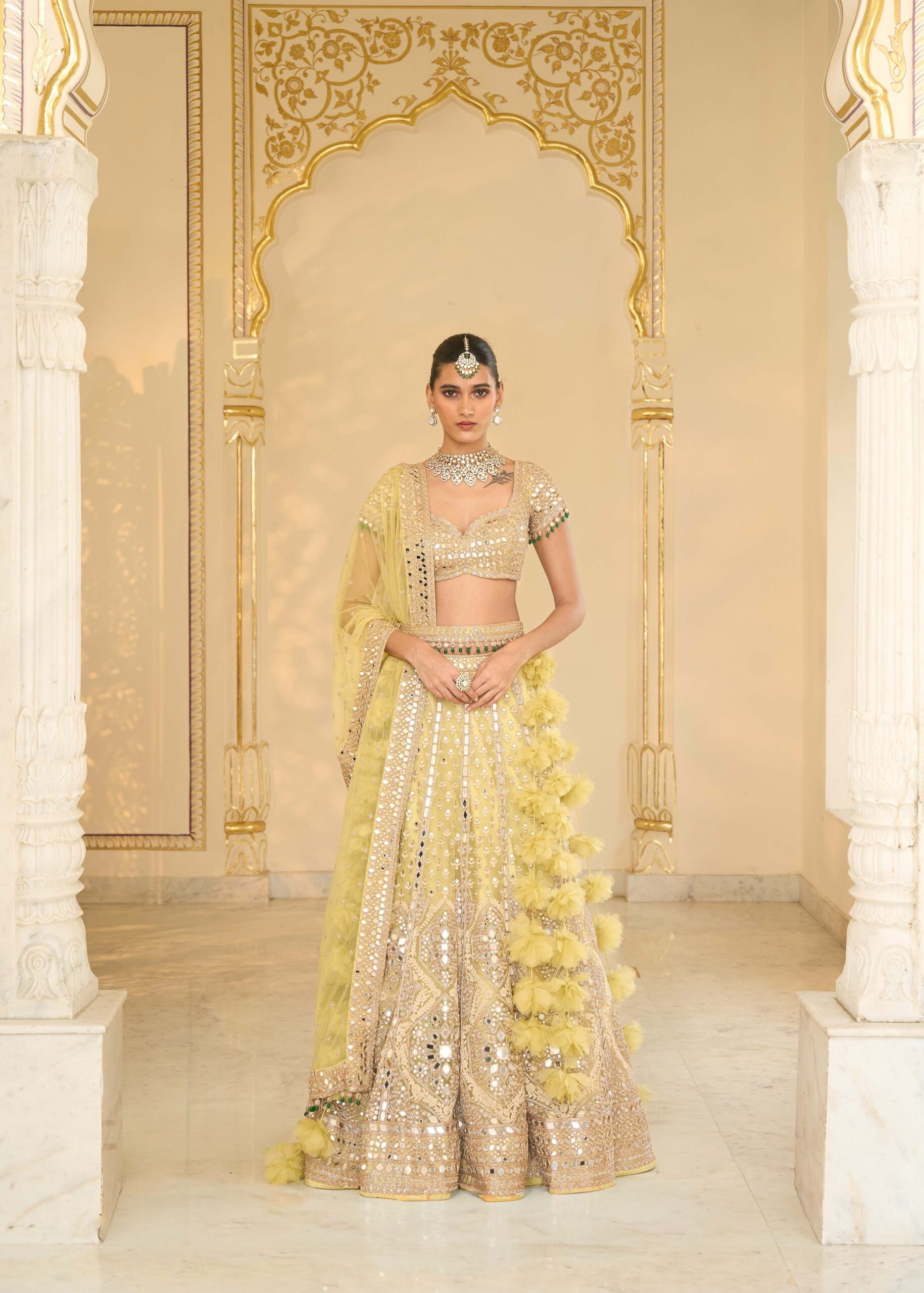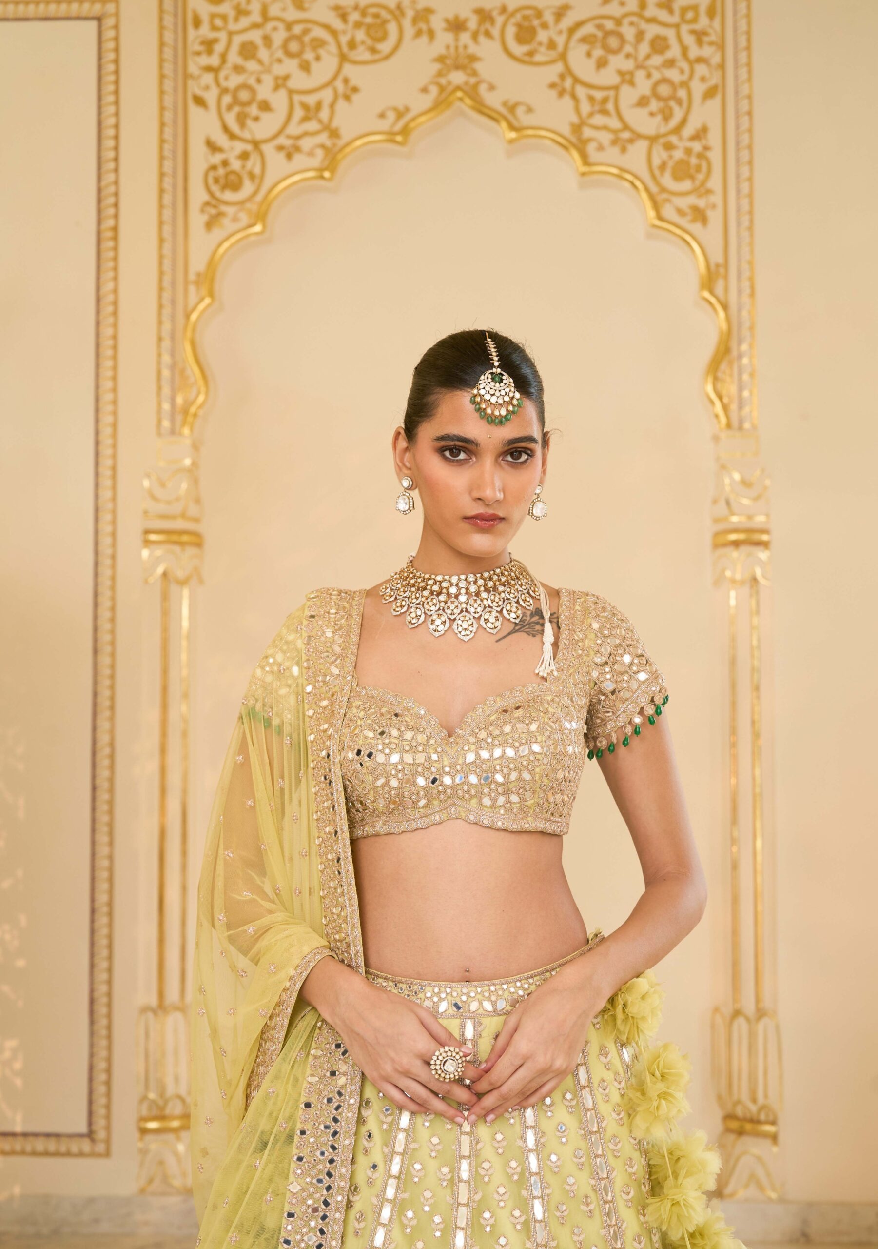 The lehenga flows beautifully with a generous flare that enhances movement and adds regal volume. Crafted from embroidered net, it showcases intricate handwork arranged to create a harmonious visual pattern. The piece is finished with handcrafted organza flower tassels, adding a soft, artistic touch to the overall design.