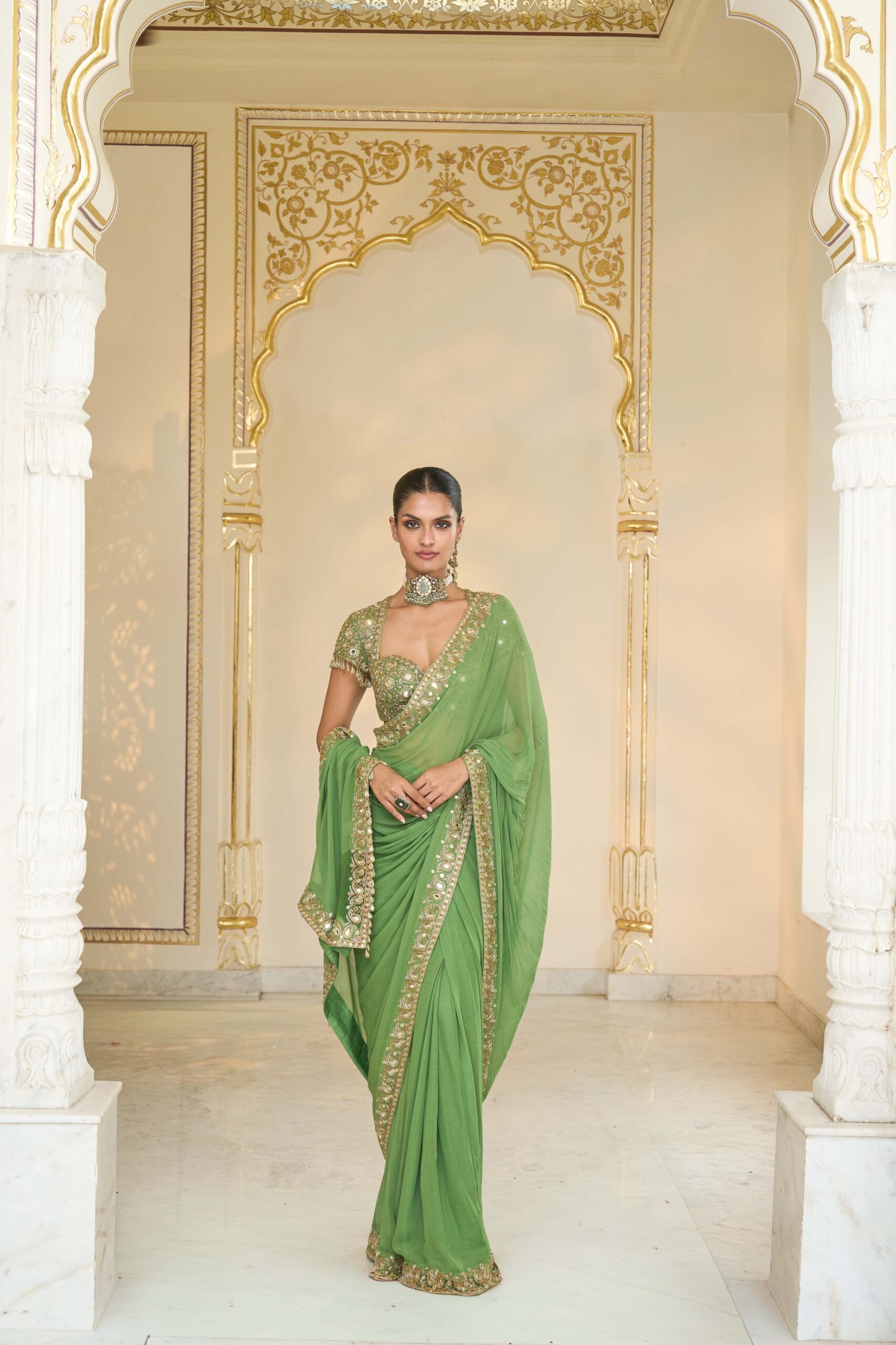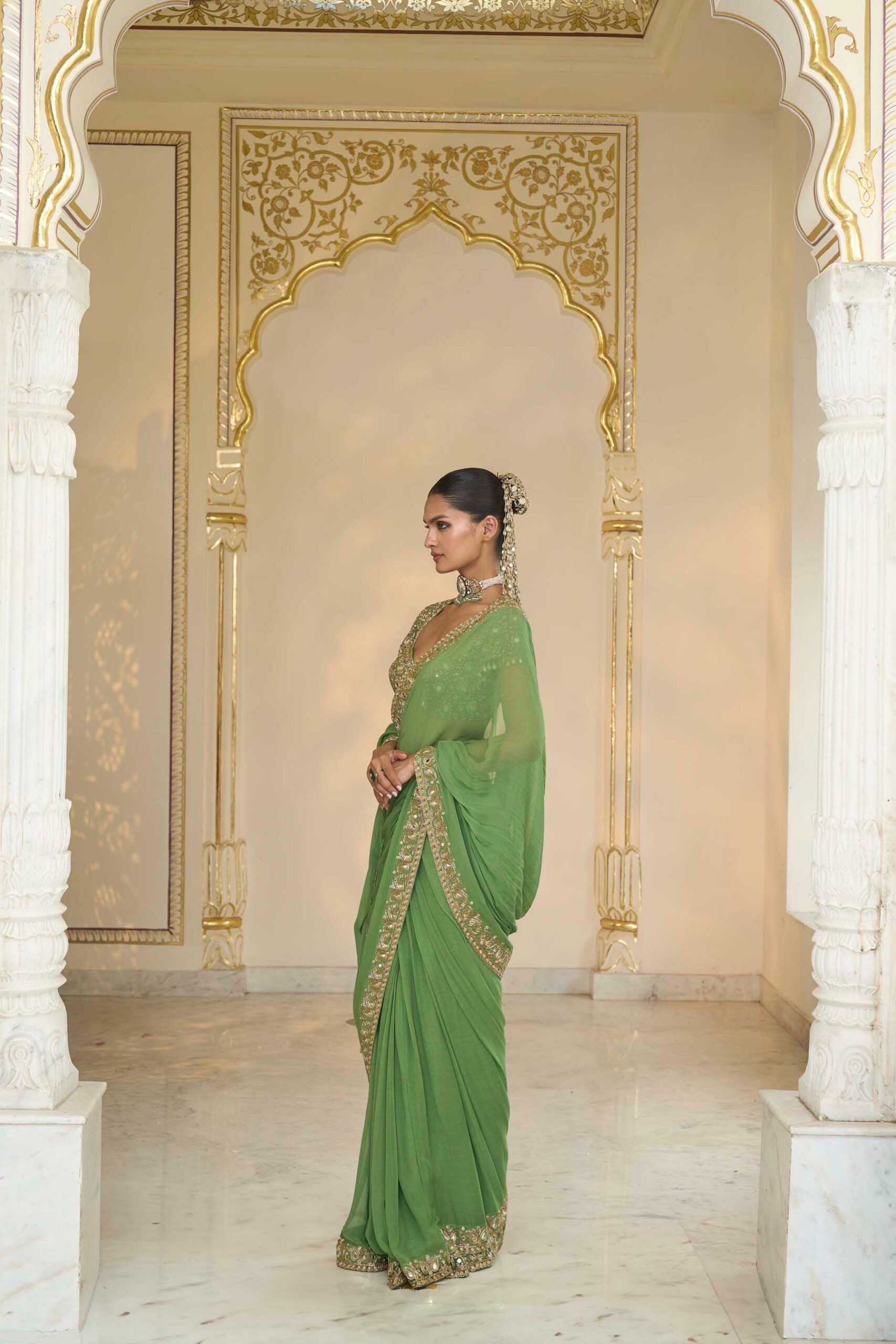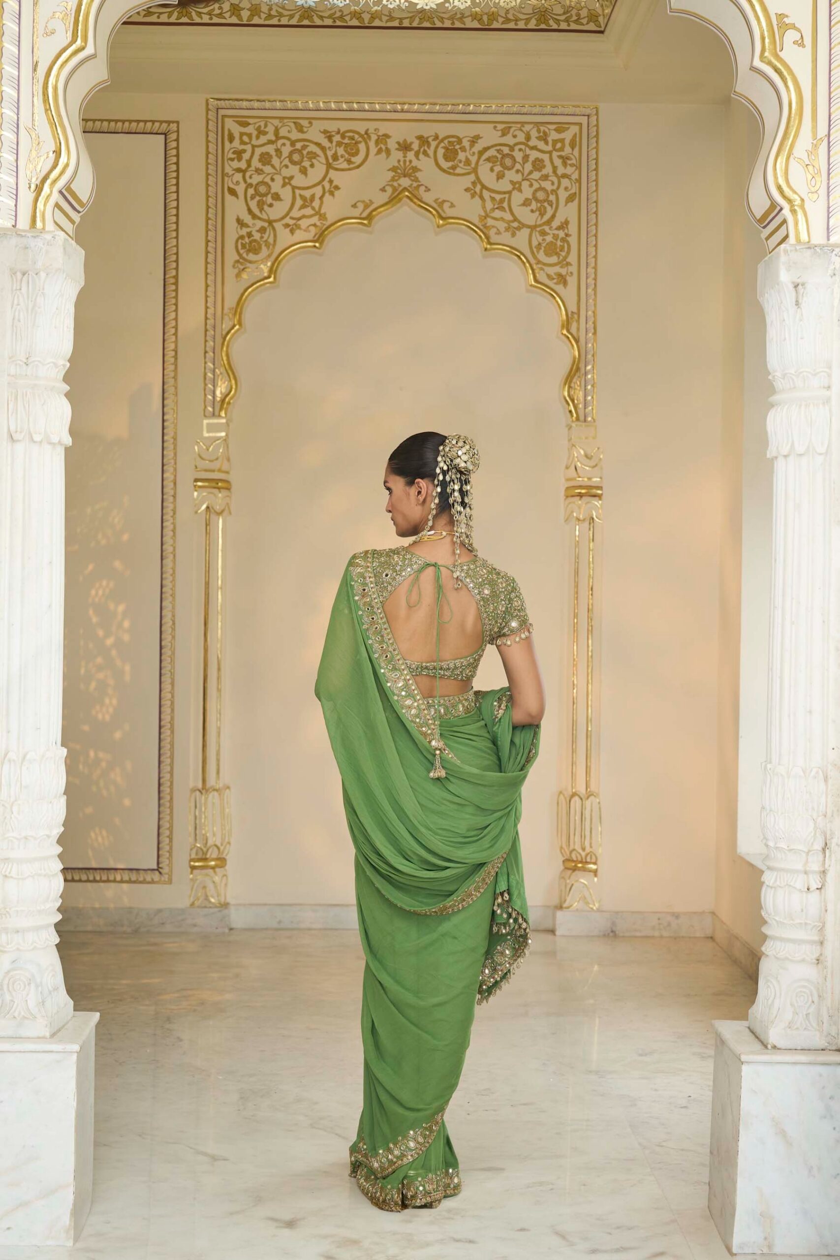 The coordinating blouse complements the sari with a classic cut and refined structure. Detailed embroidery on the blouse mirrors the sari’s embellishments, creating a harmonious and sophisticated ensemble suitable for formal occasions.