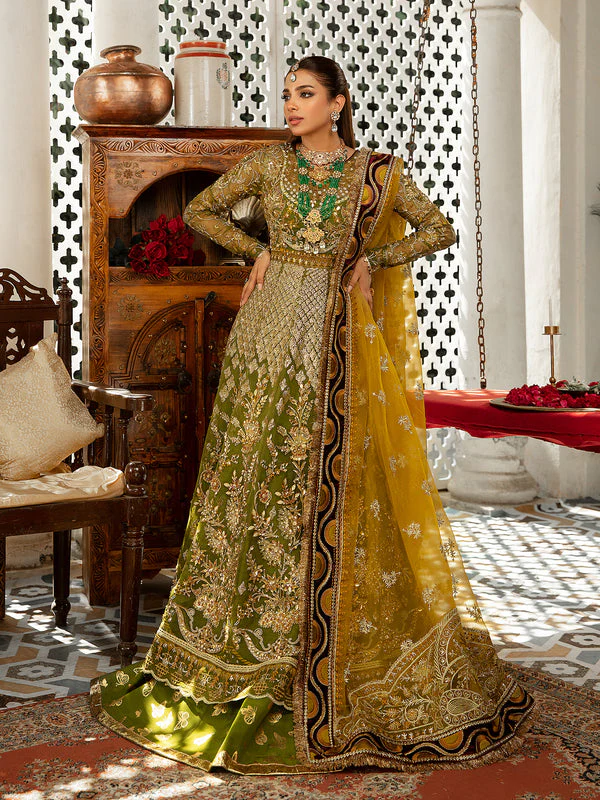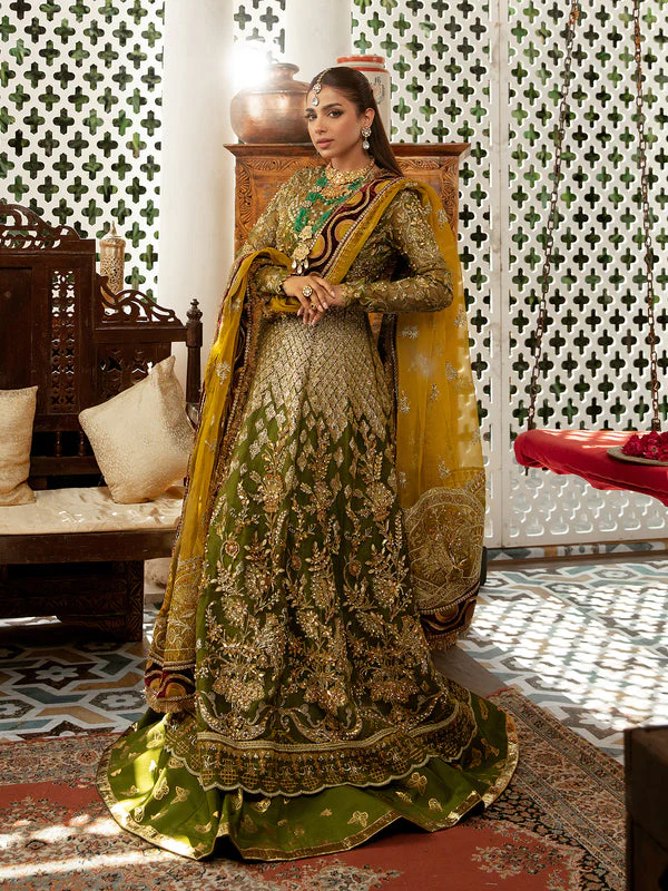 This elegant Mehndi Pishwas Frock is crafted from premium organza fabric, providing a delicate and flowing silhouette. The bodice and sleeves are adorned with intricate embroidery, tilla, mukaish, Resham, and sequins, creating a regal and glamorous appeal. Hand-crafted motifs and fine threadwork make this Pishwas a true masterpiece for brides seeking a luxurious and traditional look.