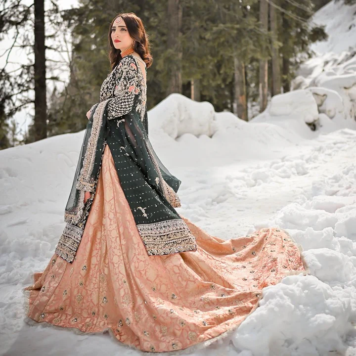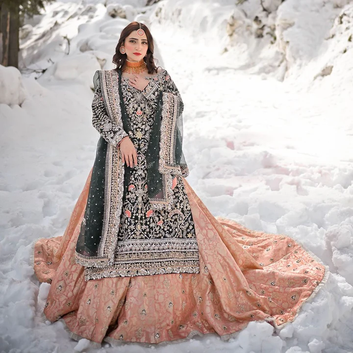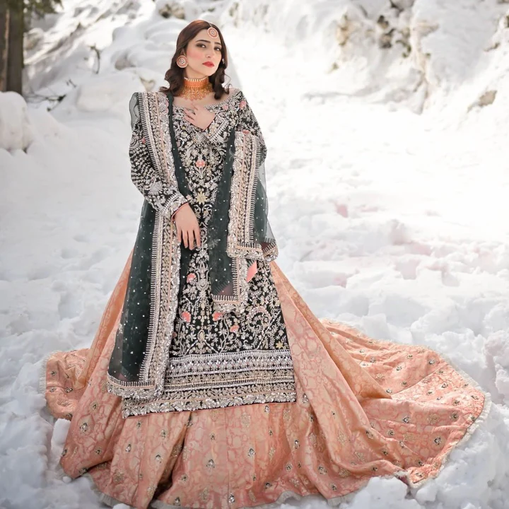 This stunning Pakistani bridal set features a richly embellished green kameez, a flowing coral pink lehenga, and a delicately adorned net dupatta. Handcrafted with intricate embroidery, dabka, zari, pearls, and sitara work, it creates a glamorous and traditional look perfect for the wedding day.