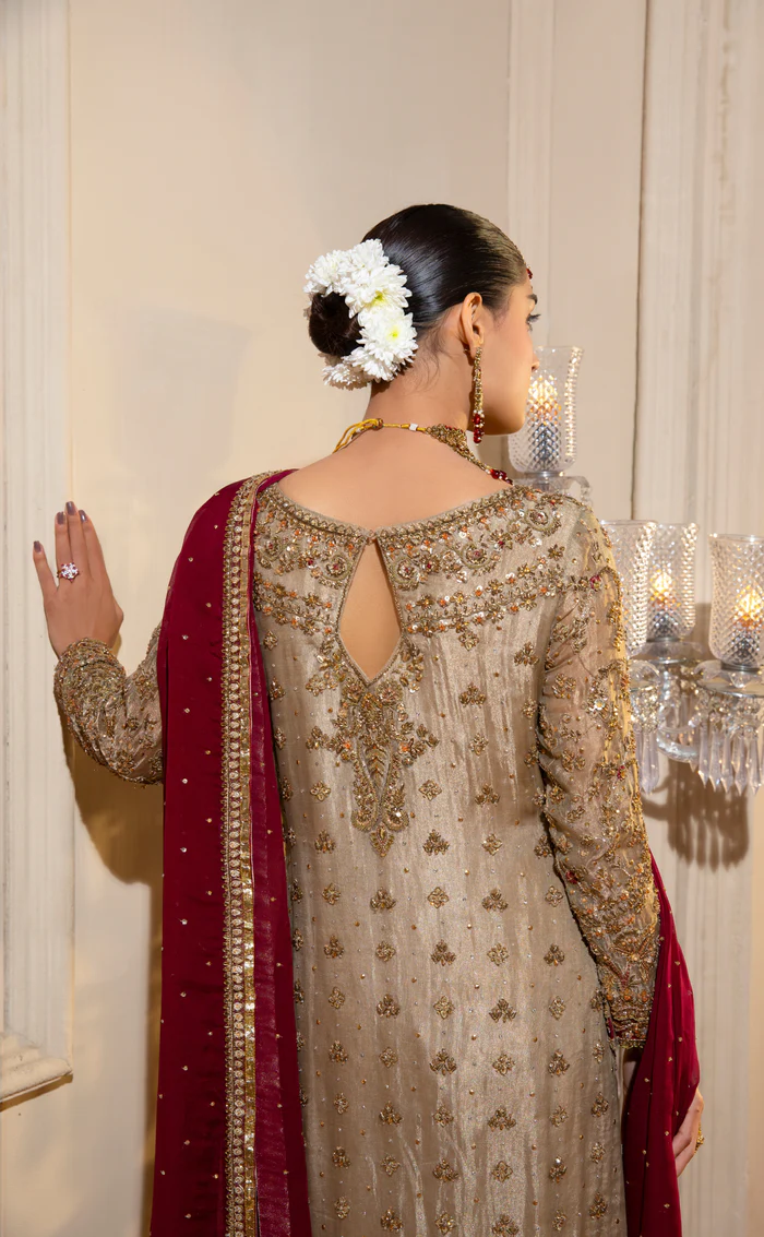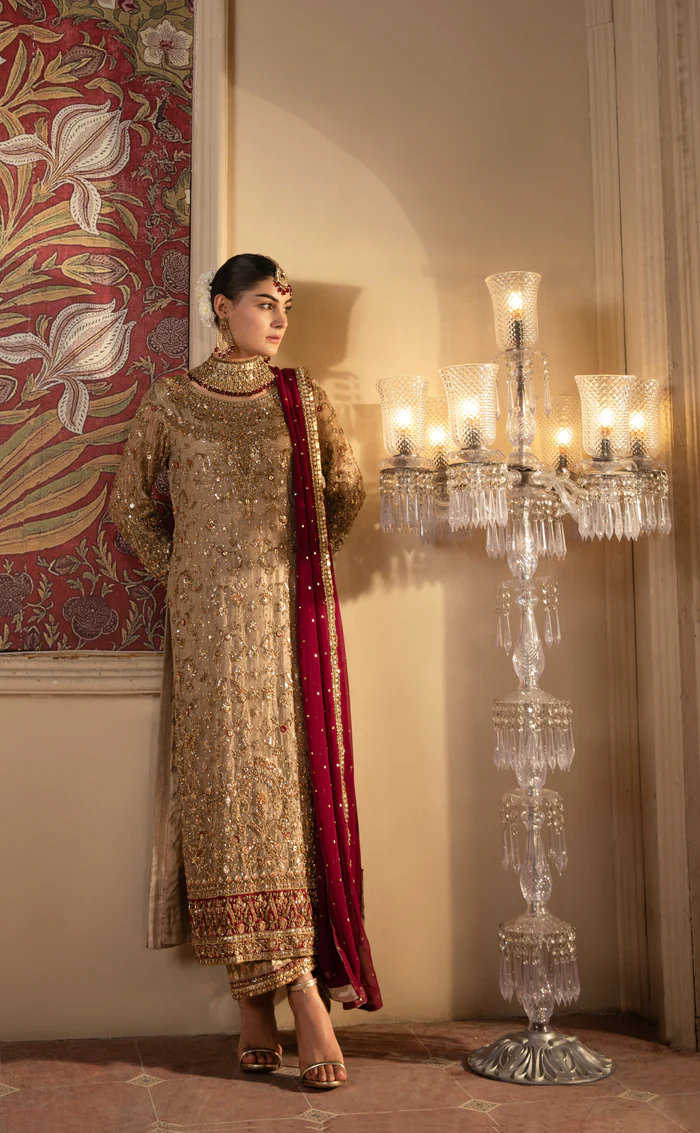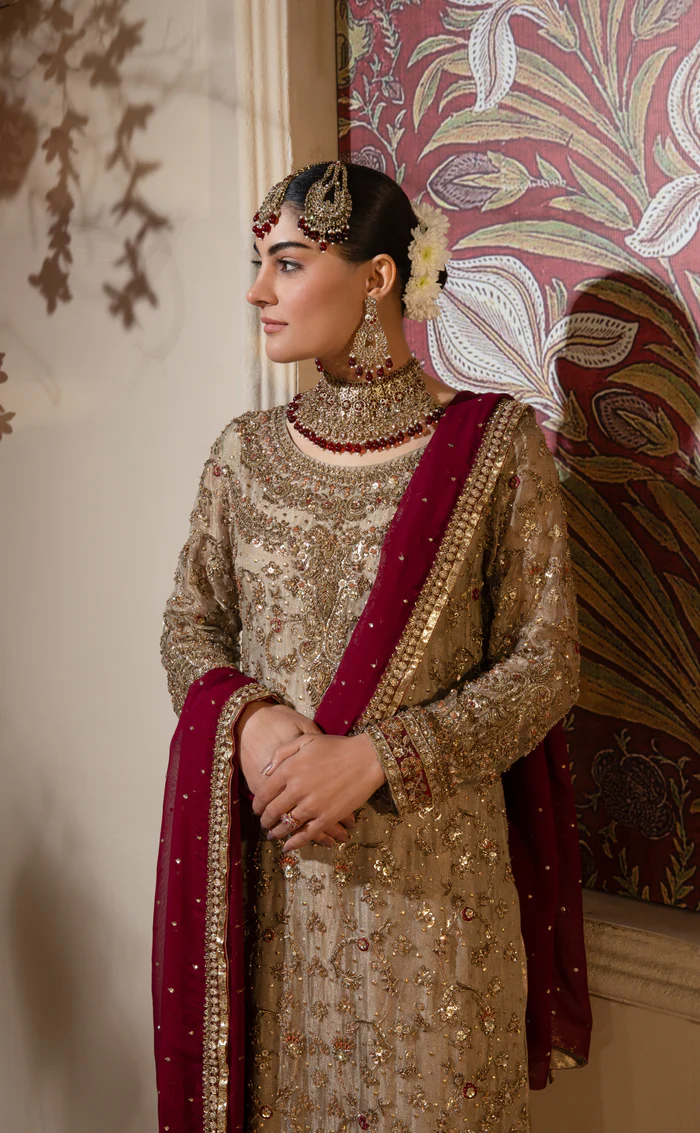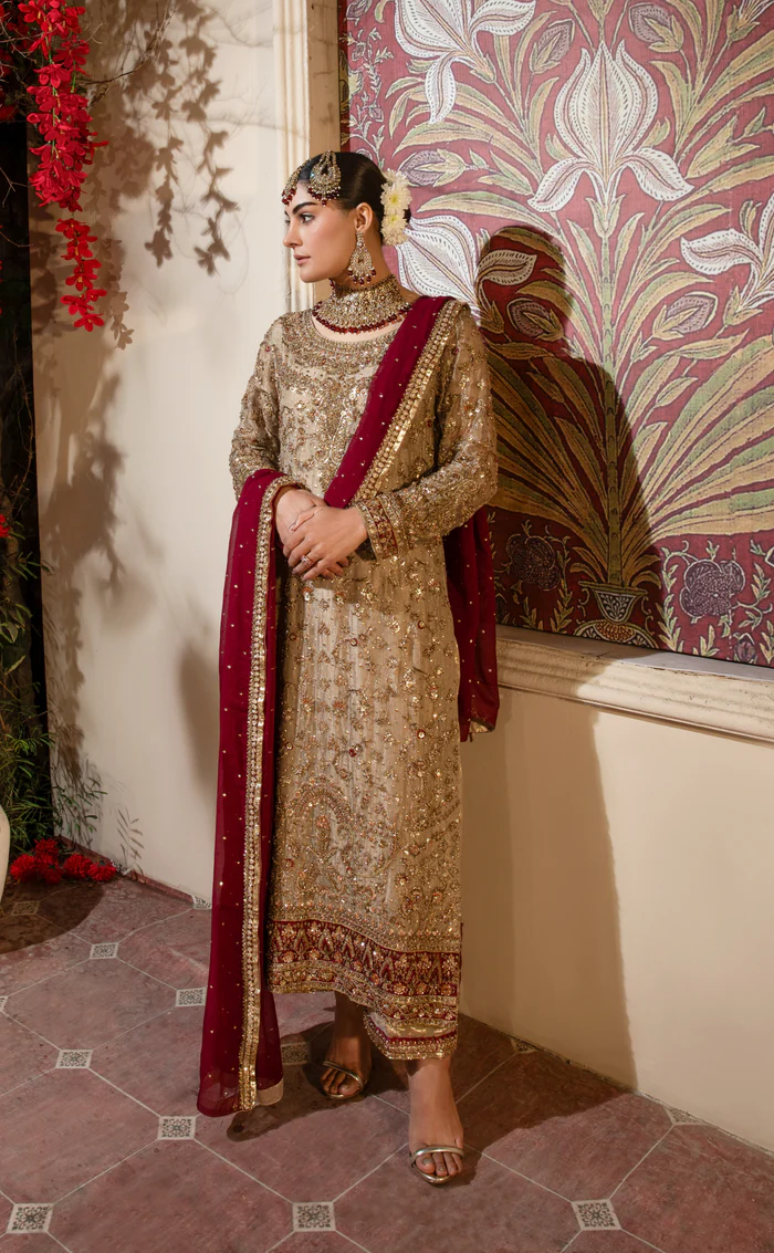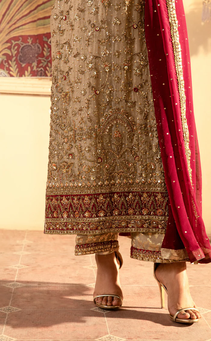 The chiffon dupatta adds softness and fluidity to the outfit. Light in weight and graceful in drape, it complements the floral gold tones beautifully. Subtle handmade embellishment enhances its elegance without overpowering the overall look, completing the ensemble with an airy, refined finish.