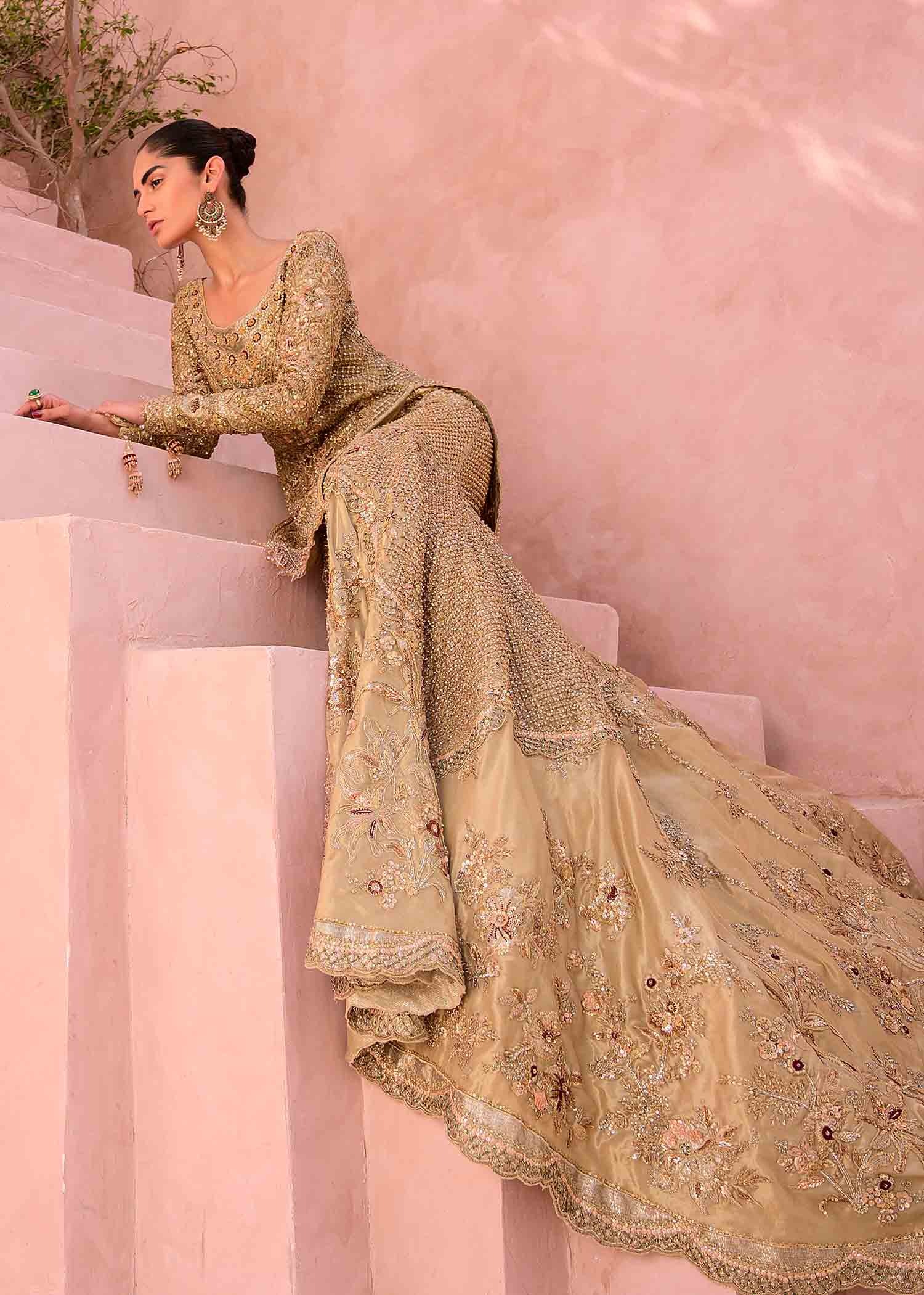 A luminous champagne gold bridal masterpiece, featuring a meticulously worked peplum-style kameez and an expansive, floor-sweeping lehenga adorned with intricate zardozi and crystalline details.