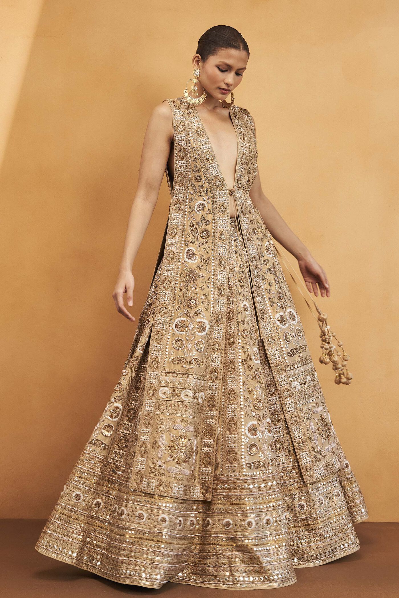 A majestic champagne-gold ensemble featuring a floor-length panelled coat silhouette, lavishly adorned with traditional hand-embroidery and mirror-work for an opulent, royal aesthetic.