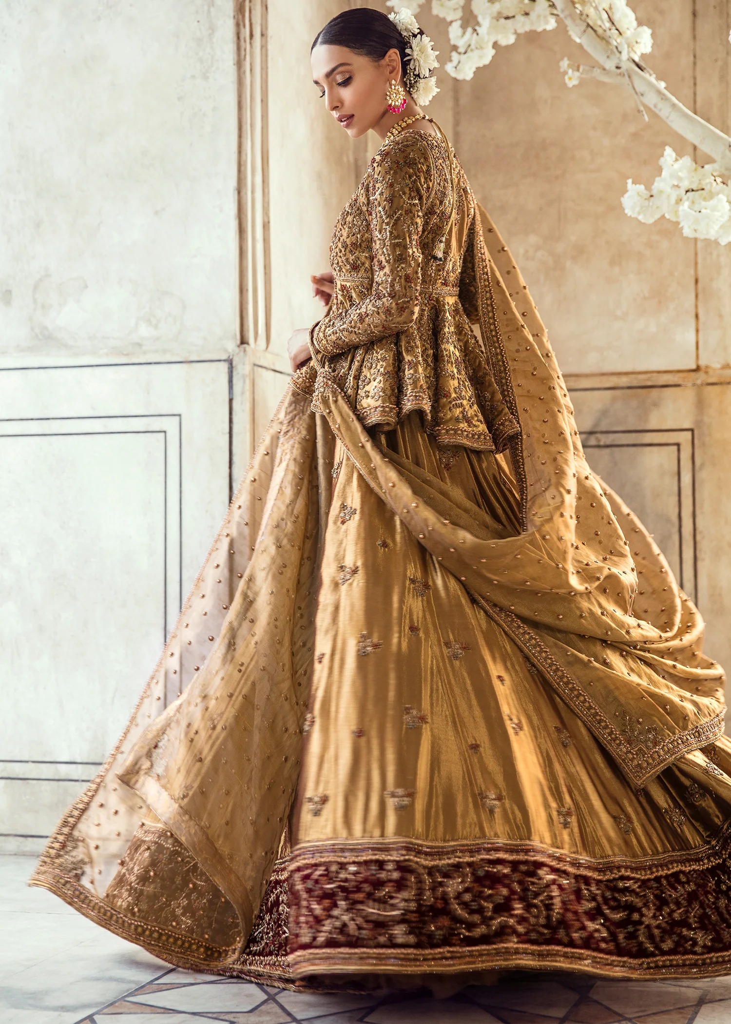 The ensemble is paired with a sheer gold net dupatta, bordered with detailed embellishment that mirrors the artisanal work of the peplum top. A fine spray of shimmering sequins and pearls is placed thoughtfully throughout the veil, while the four-sided borders are finished with a structured katan lining to preserve its graceful, fluid drape.