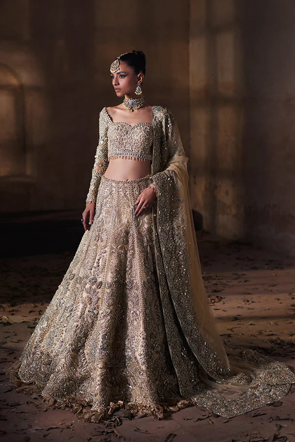 A vision of golden splendor, Raya is a luxurious bridal ensemble featuring an intricately embellished net creation paired with a dramatic double-layered tissue lehenga, designed to make your wedding day truly unforgettable.