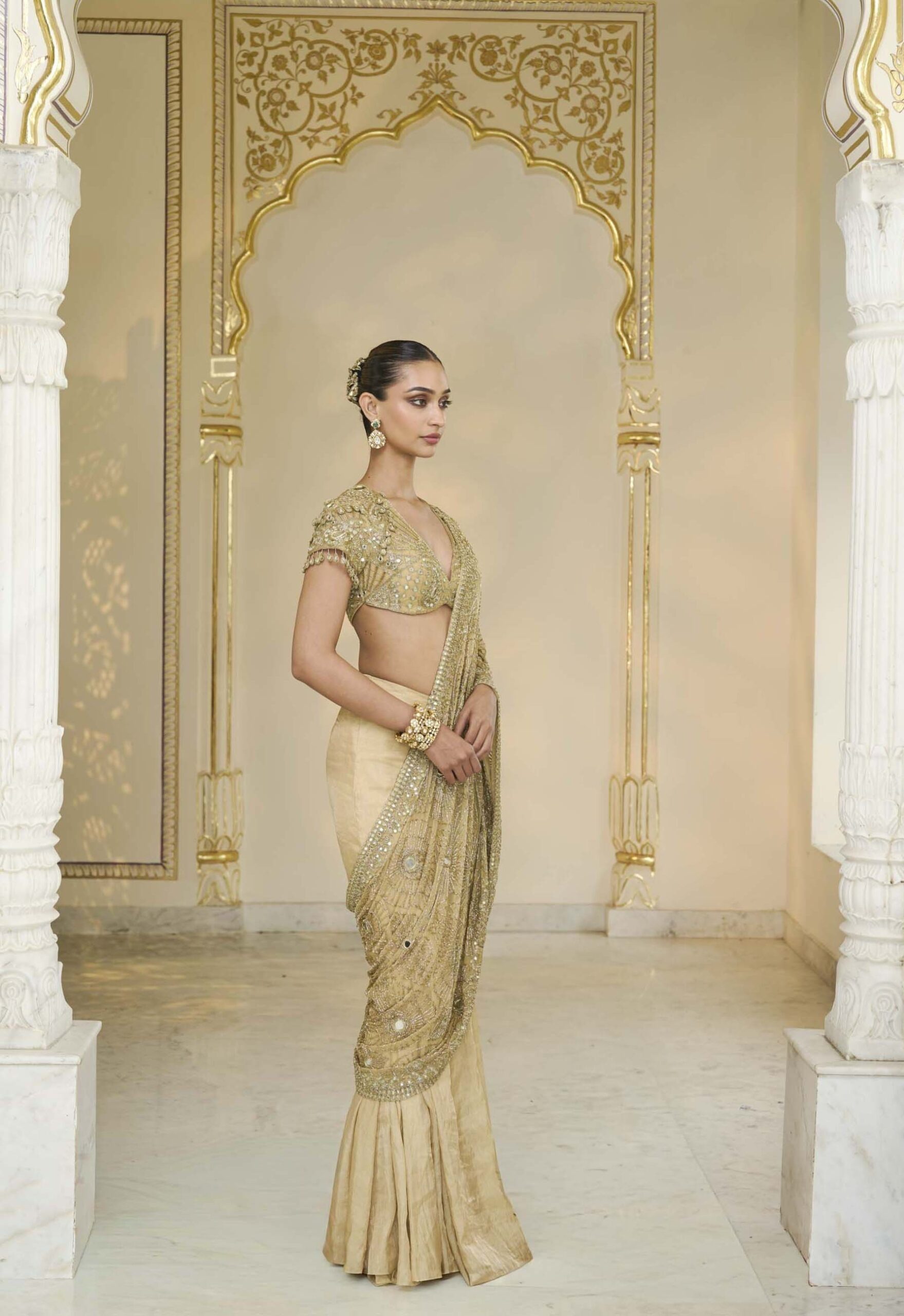 The sari is shaped with fluid drape and enhanced with godet inserts that create volume and flare. Crafted in gold tissue, it is adorned with precision-placed mirror accents, cutdana detailing, and kasab handwork. The blend of texture and shimmer offers an opulent, contemporary interpretation of classic elegance.