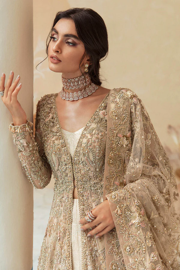 A meticulous bridal creation designed for the grandeur of wedding season. The open-style net gown is rendered in an elegant golden-beige hue, lavishly adorned across the entire canvas with exquisite dabka and naqshi craftsmanship. The embellishment is further enriched with crystals, pearls, and fine threadwork, creating a harmonious play of texture and shine that delivers a soft yet gleaming bridal allure.