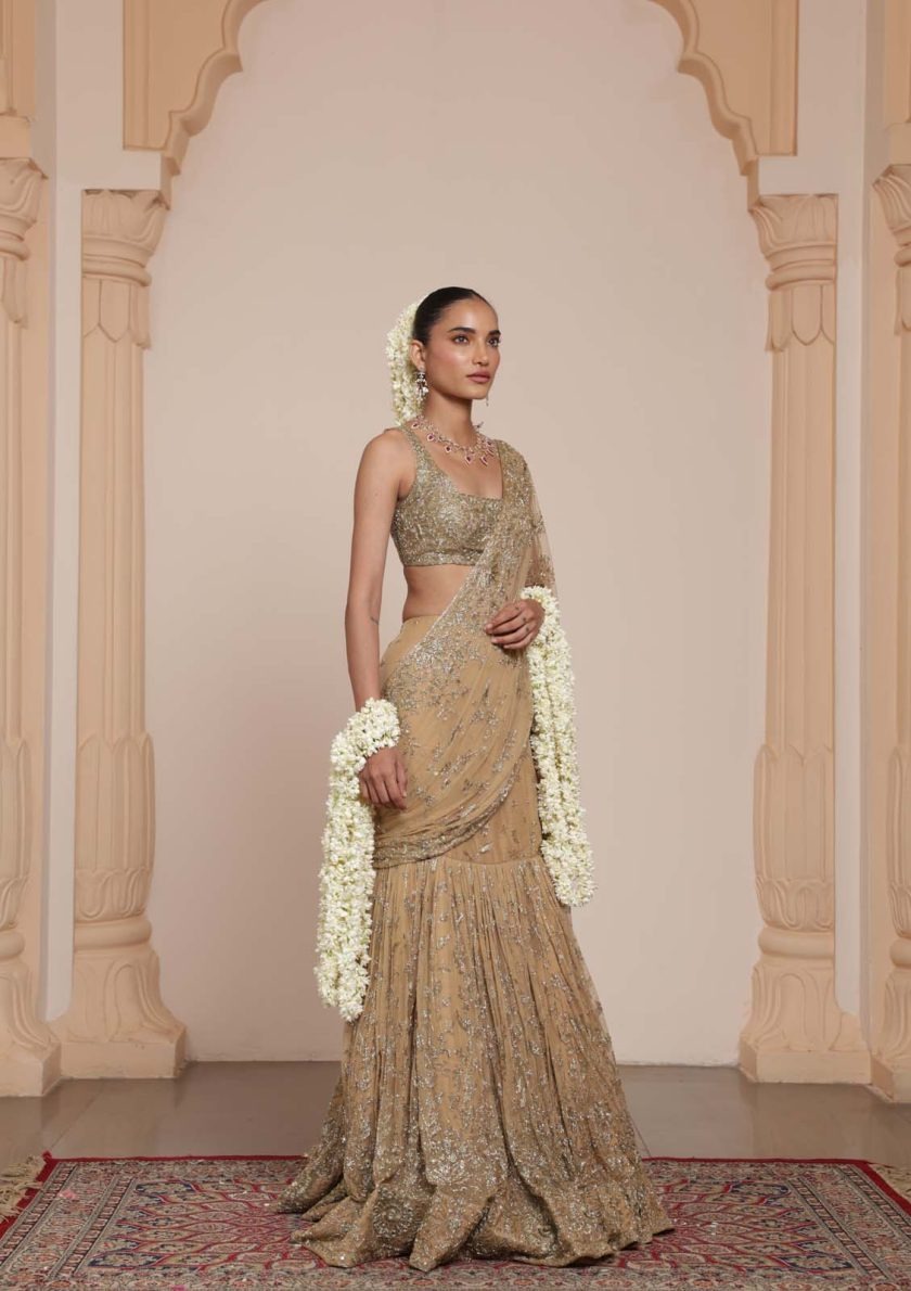 A stunning beige and gold sari set featuring delicate net fabric, hand-embroidered mirror, cutdana, and sequin detailing, perfect for weddings and festive occasions