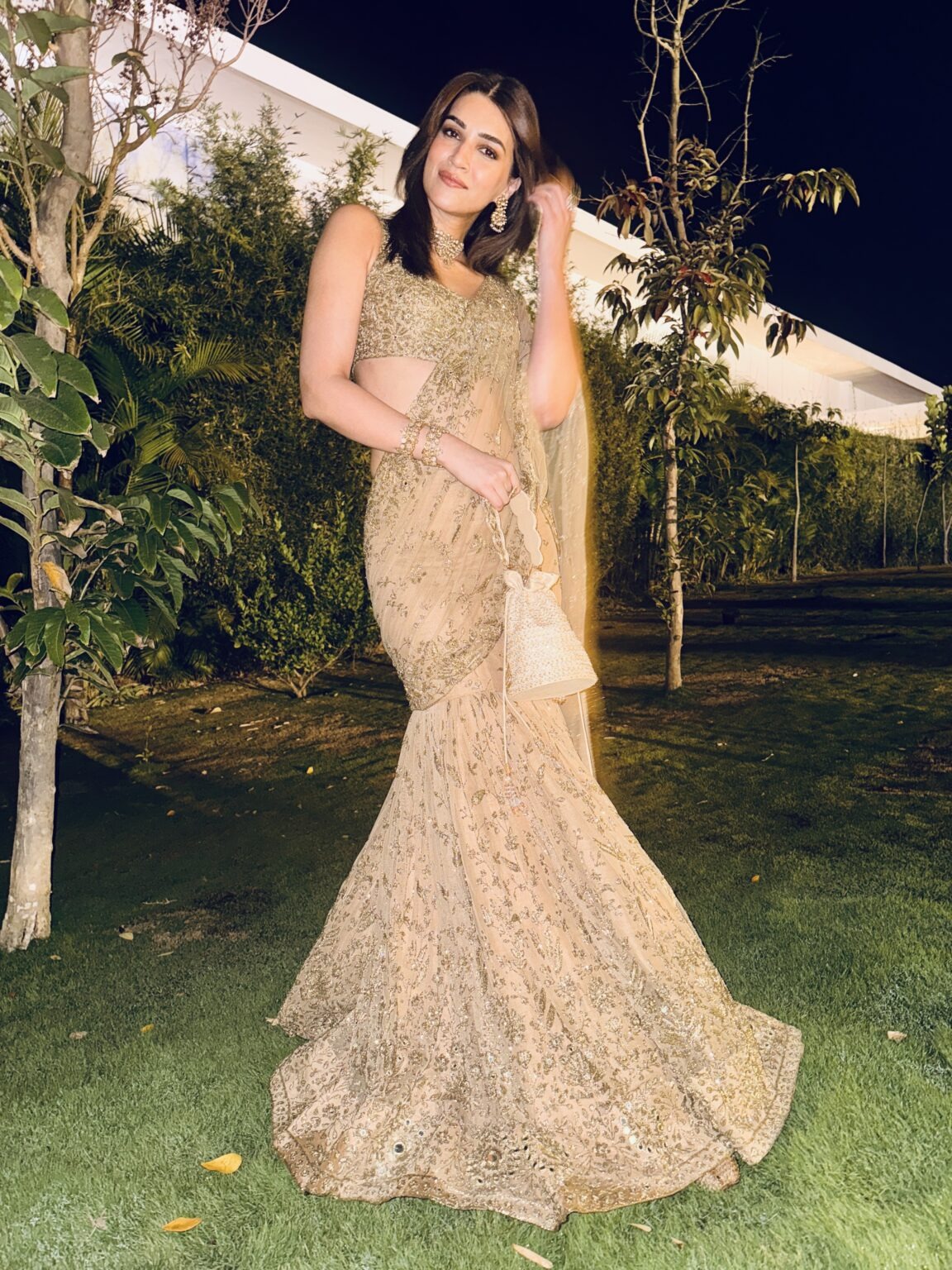 The sari is crafted from soft, skin-like net in a warm beige tone, providing a luxurious drape and elegant flow. Hand-applied mirror, cutdana, and sequin work are intricately placed across the fabric to create a shimmering, eye-catching effect while maintaining refined balance.