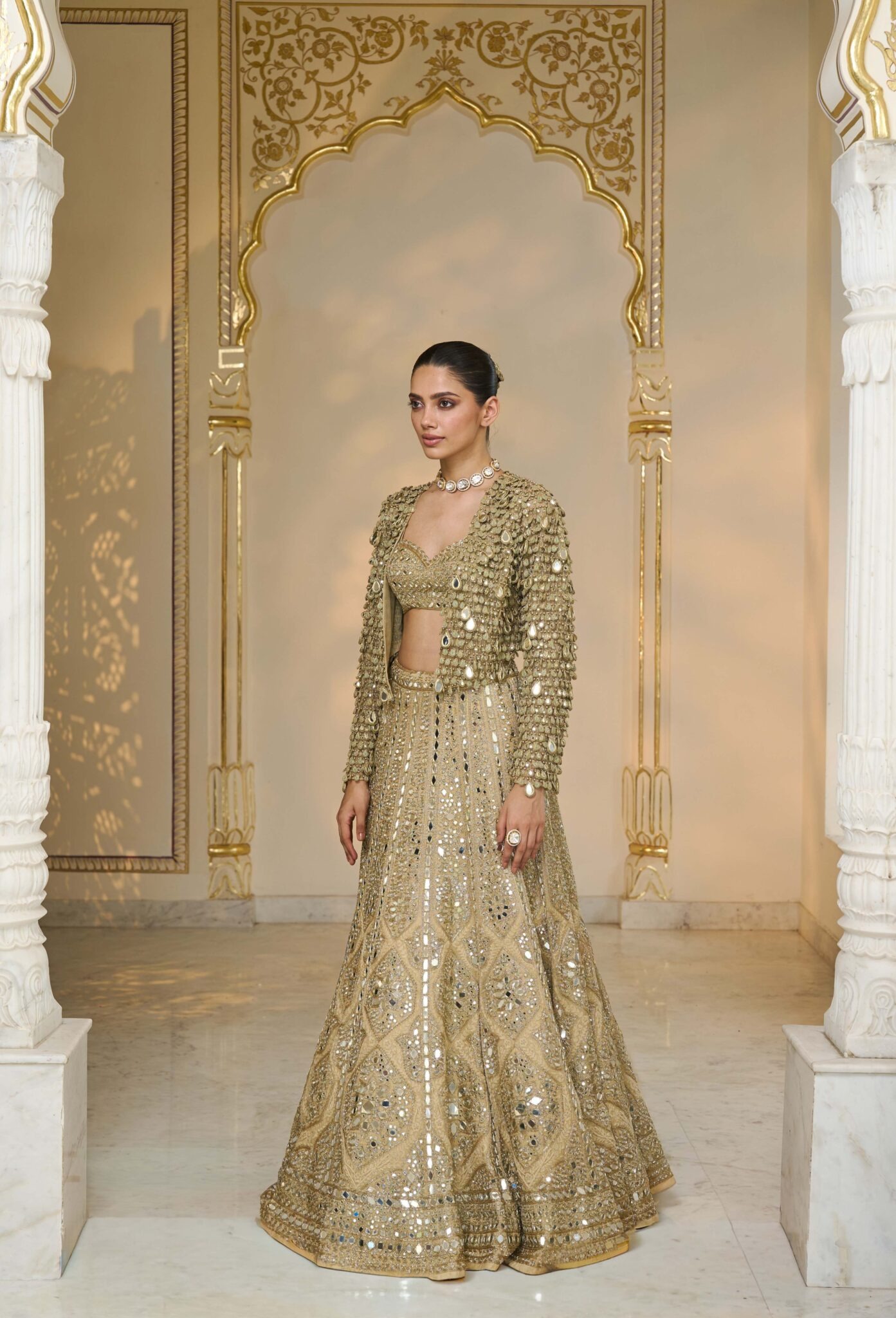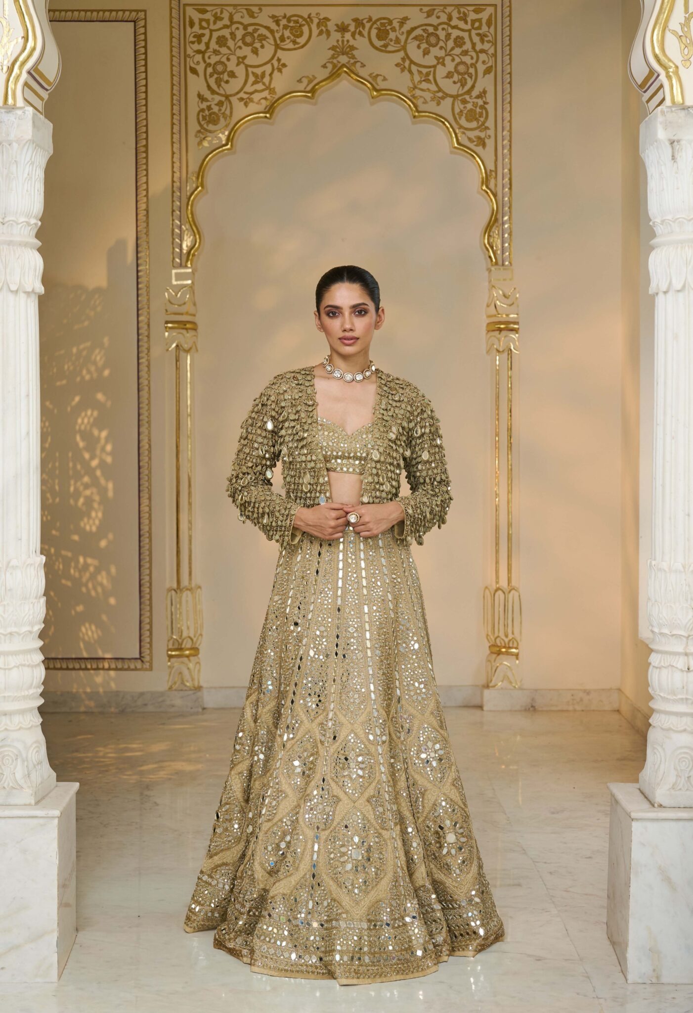 The ensemble is completed with a delicate hand-embroidered mirror tassel jacket. The jacket adds depth and sophistication to the outfit while allowing for versatile styling options, making the look contemporary yet traditional.