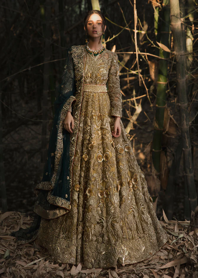 The accompanying green net dupatta introduces a striking contrast to the golden tones of the dress. It is framed with embellished borders on all sides, including a wider decorative border running lengthwise for added definition. Delicate floral motifs are scattered throughout, lending a soft and ethereal charm to the overall look.