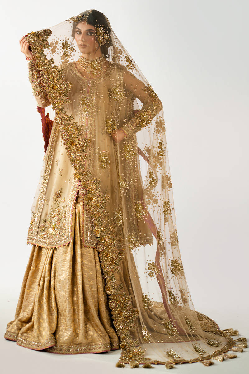 Paired with the gown is a jamawar tailed gharara that adds heritage richness to the ensemble. The gharara is tailored with a graceful spread and structured tail, offering a classic silhouette that balances the modern cut of the gown.