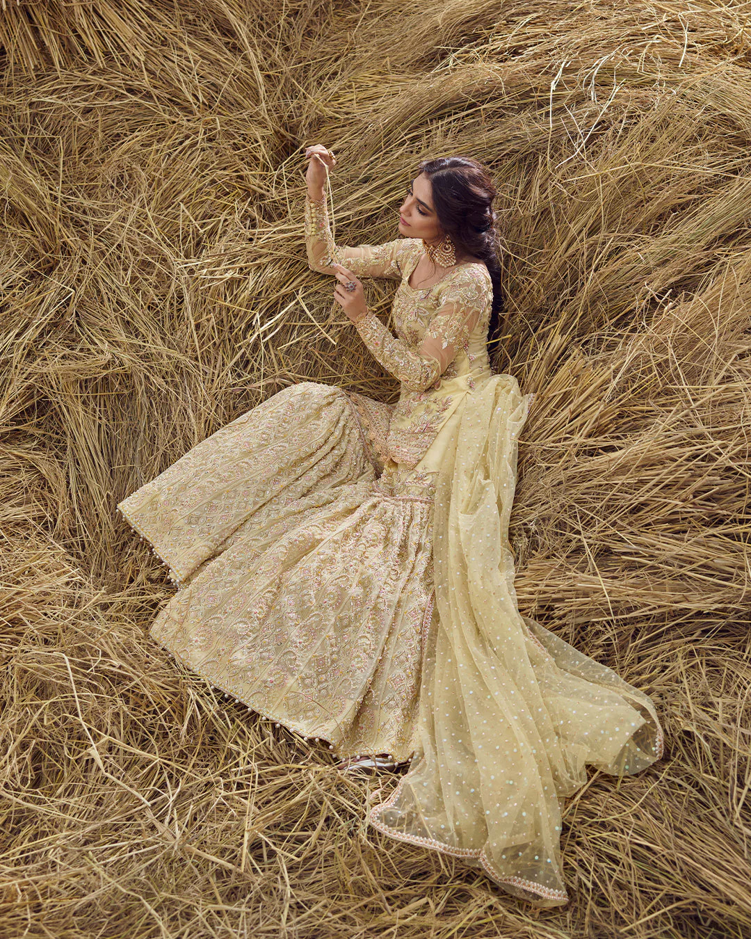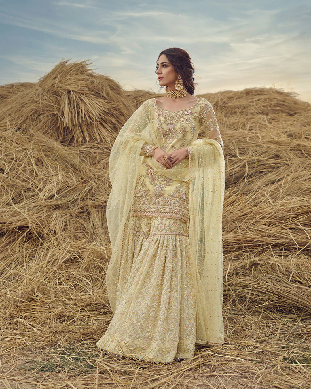 A radiant yellow gharara set showcasing delicate floral artistry and masterful hand embellishment, designed to celebrate tradition with refined elegance.