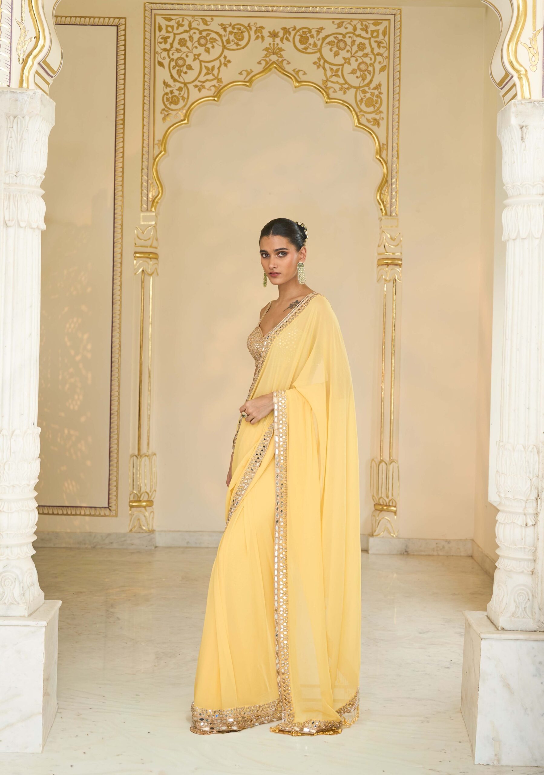 A delicately handcrafted saree and blouse set in soft butter-yellow tones, highlighted with rose-gold artistry and elegant detailing for a graceful ceremonial look.