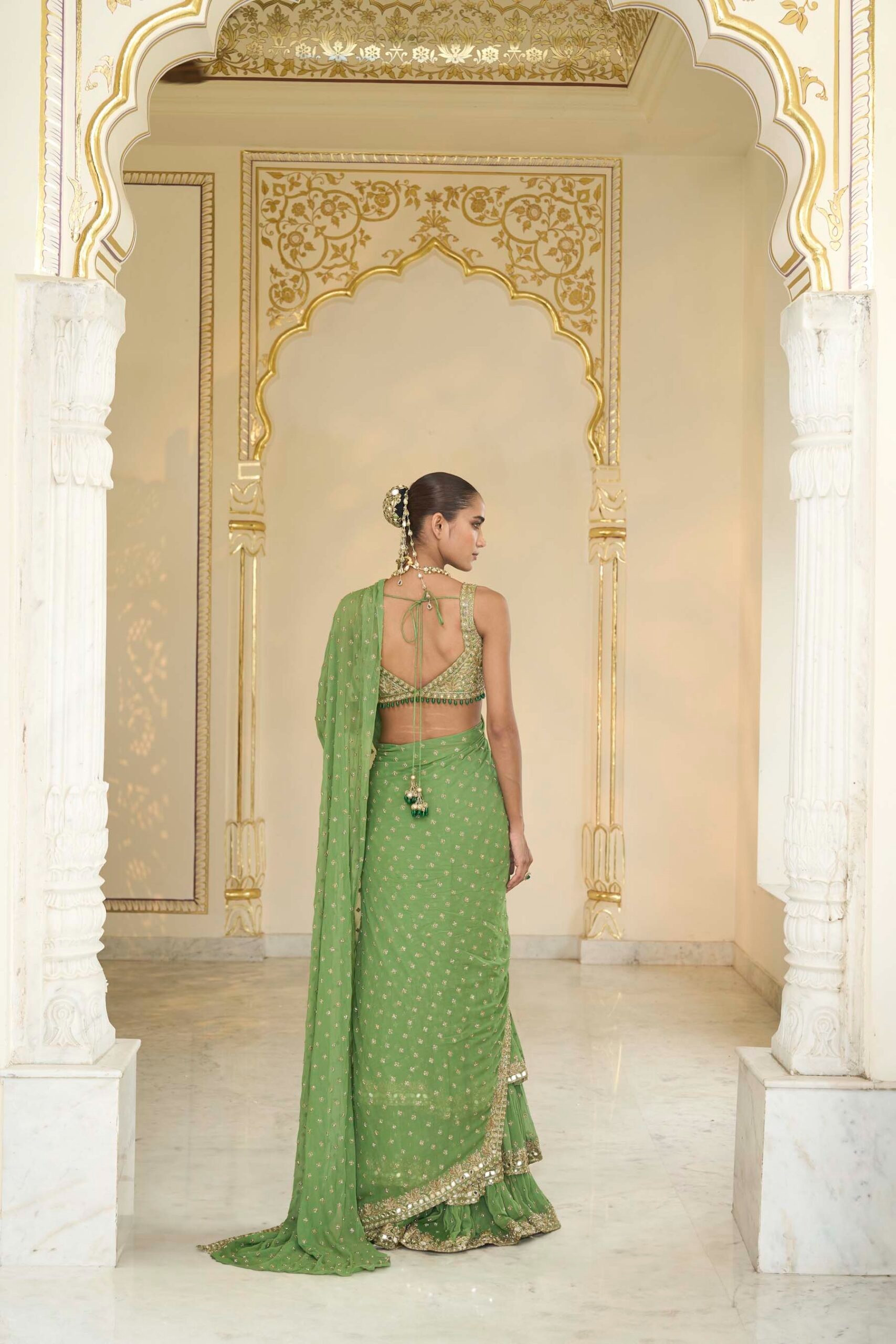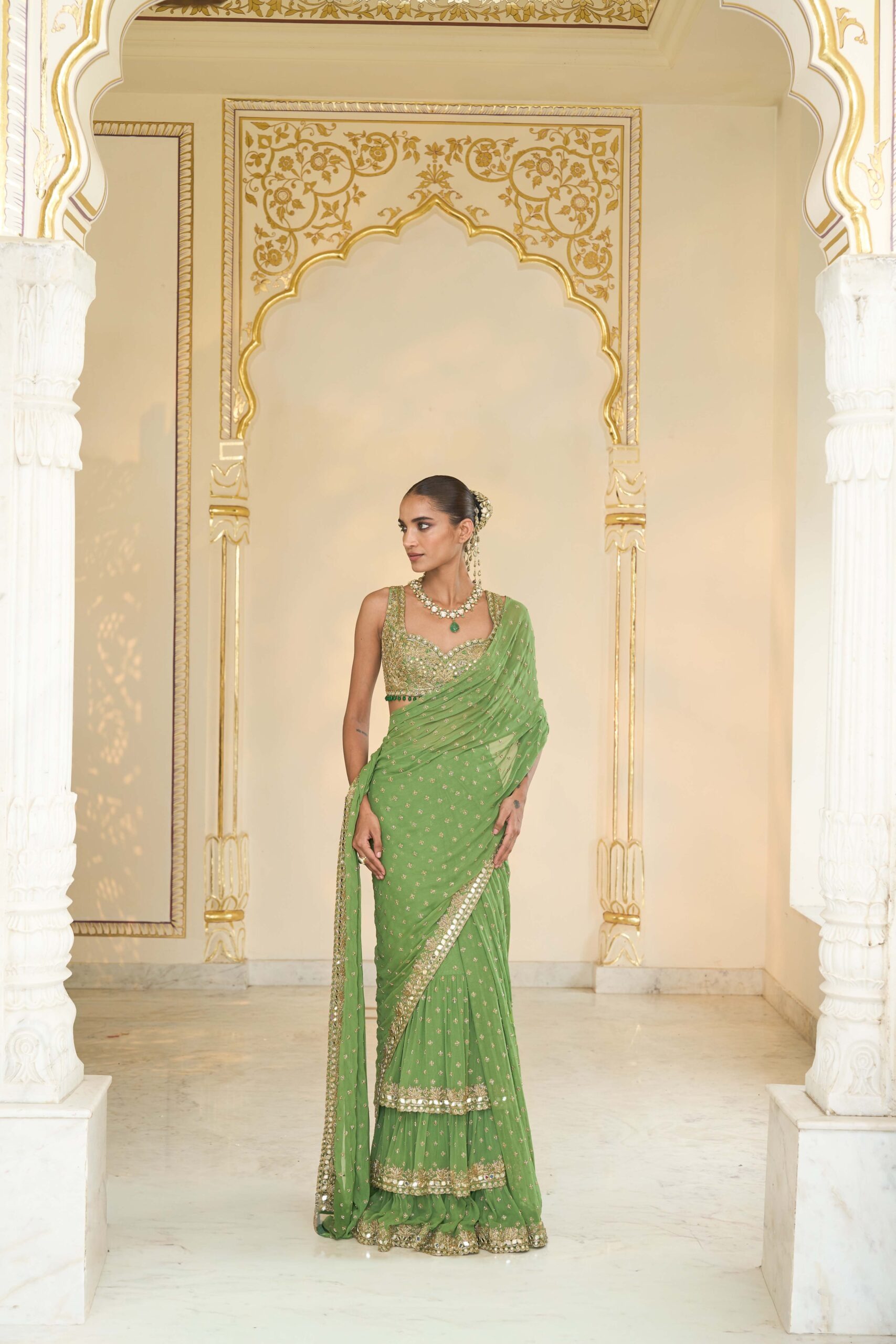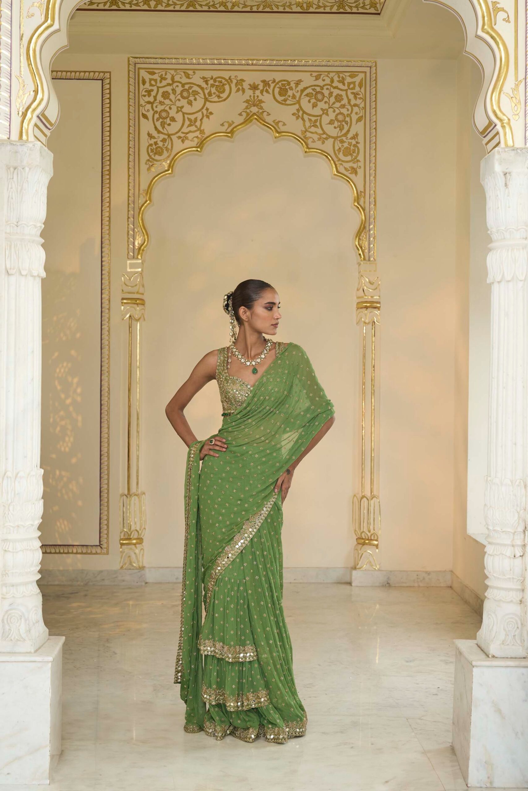 A warm olive and beige-gold sari set featuring a beautifully tiered drape, paired with an intricately hand-embellished blouse crafted for elevated festive and wedding elegance.