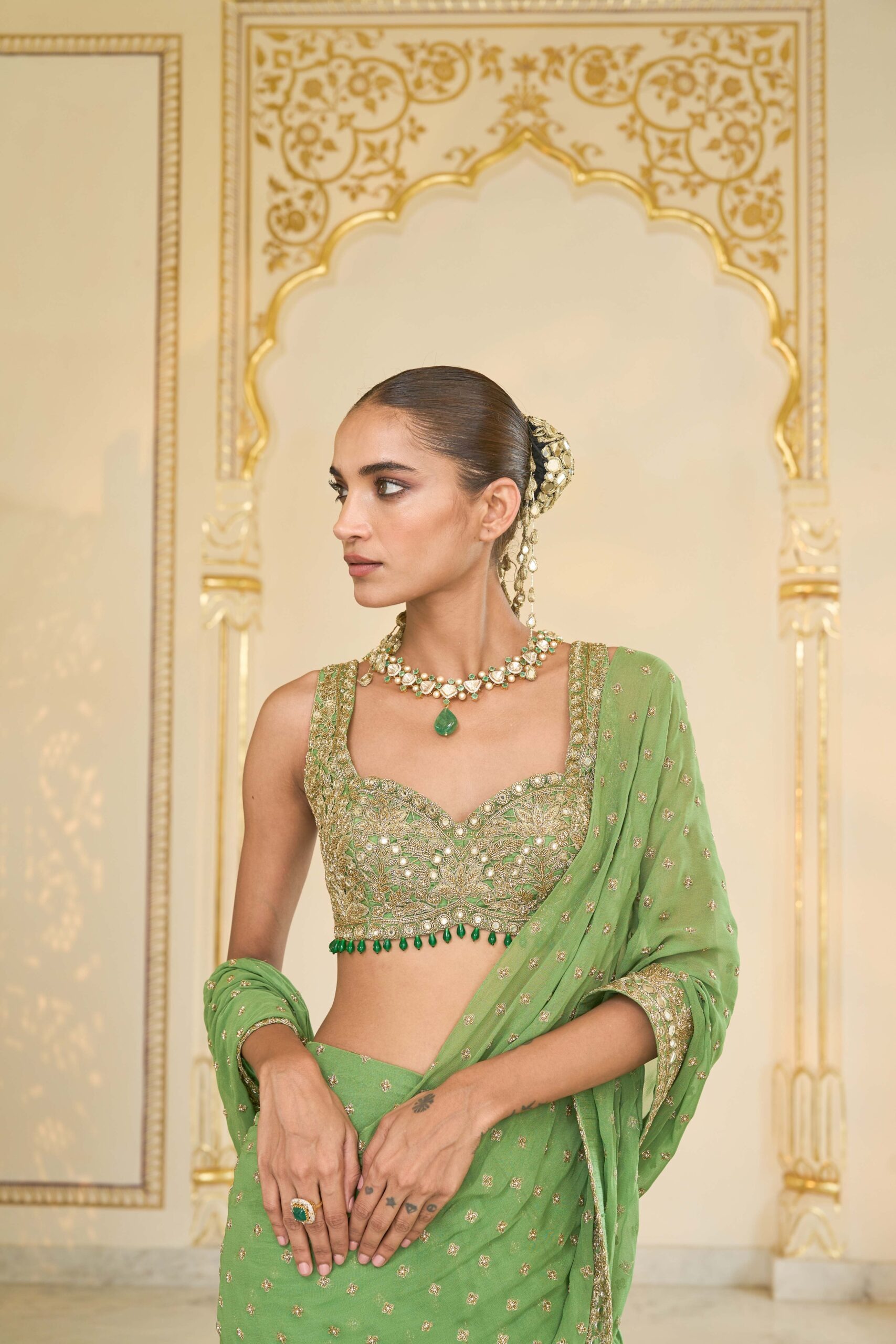 Hand-applied mirrorwork, cutdana detailing, and fine embroidery arranged to bring texture, radiance, and artisanal finesse to the overall outfit.
