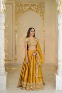 The blouse is tailored from premium banarasi fabric featuring a luxurious yellow and rose-gold color blend. Hand-embroidered detailing including reflective elements and fine thread artistry adds depth and brilliance, creating a refined bridal statement. The structured finish ensures a flattering, polished silhouette for formal celebrations.