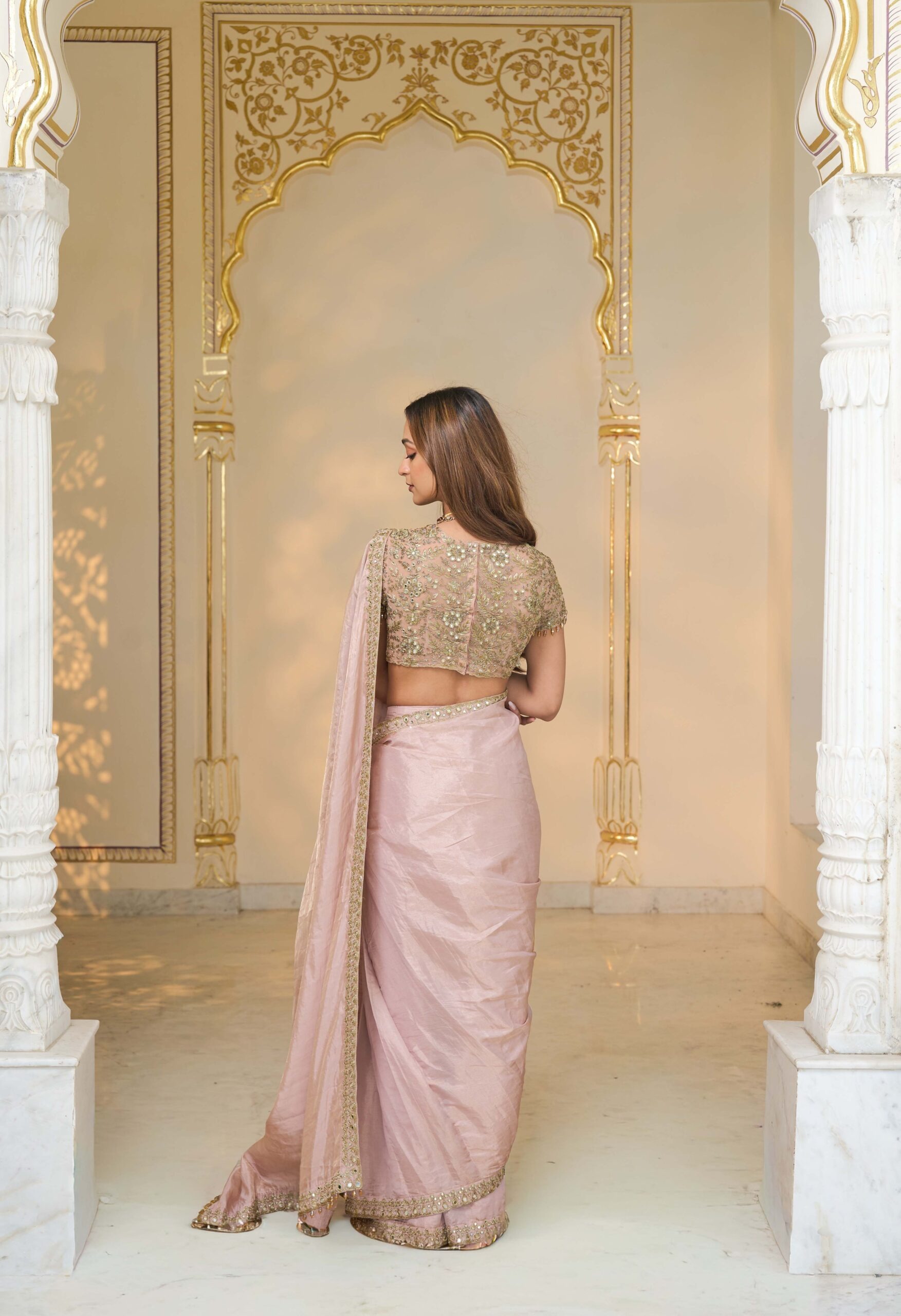The saree is designed in a graceful blend of old rose and beige gold, crafted to create a soft yet luxurious visual appeal. The drape is enhanced with intricate hand embroidery arranged thoughtfully across the fabric. Each detail is positioned to add dimension and highlight the subtle sheen of the base tone, resulting in an elegant and refined silhouette.
