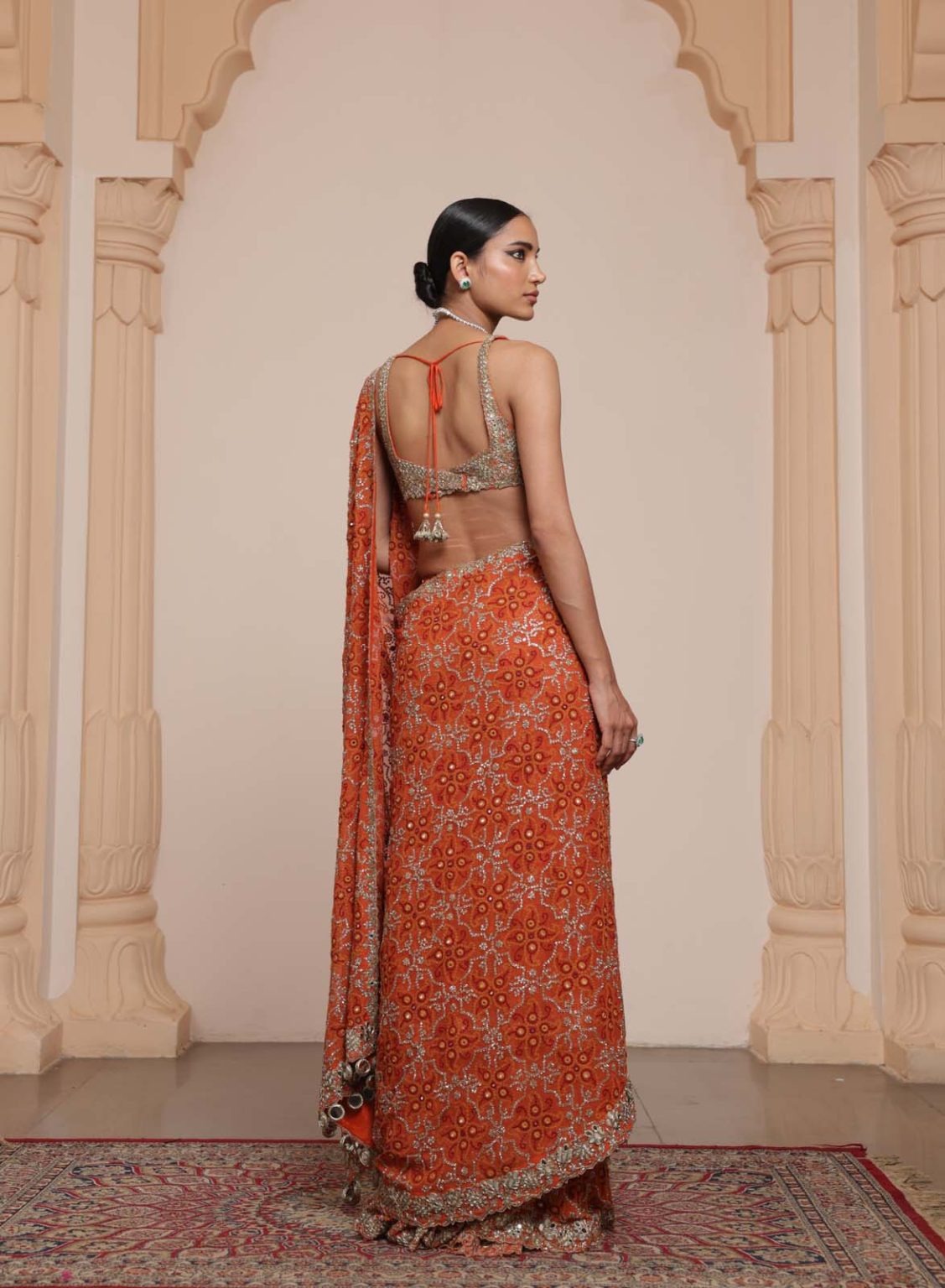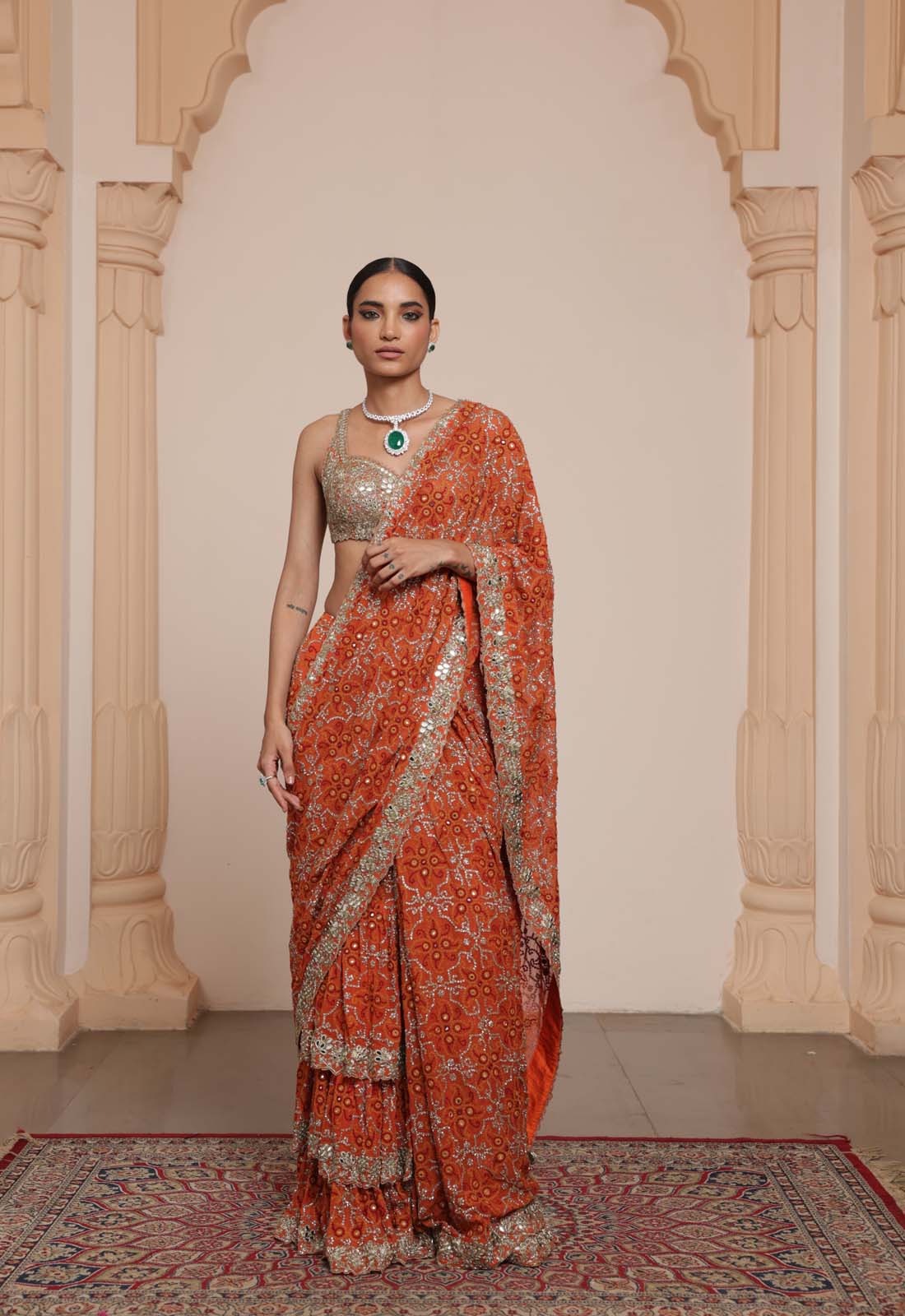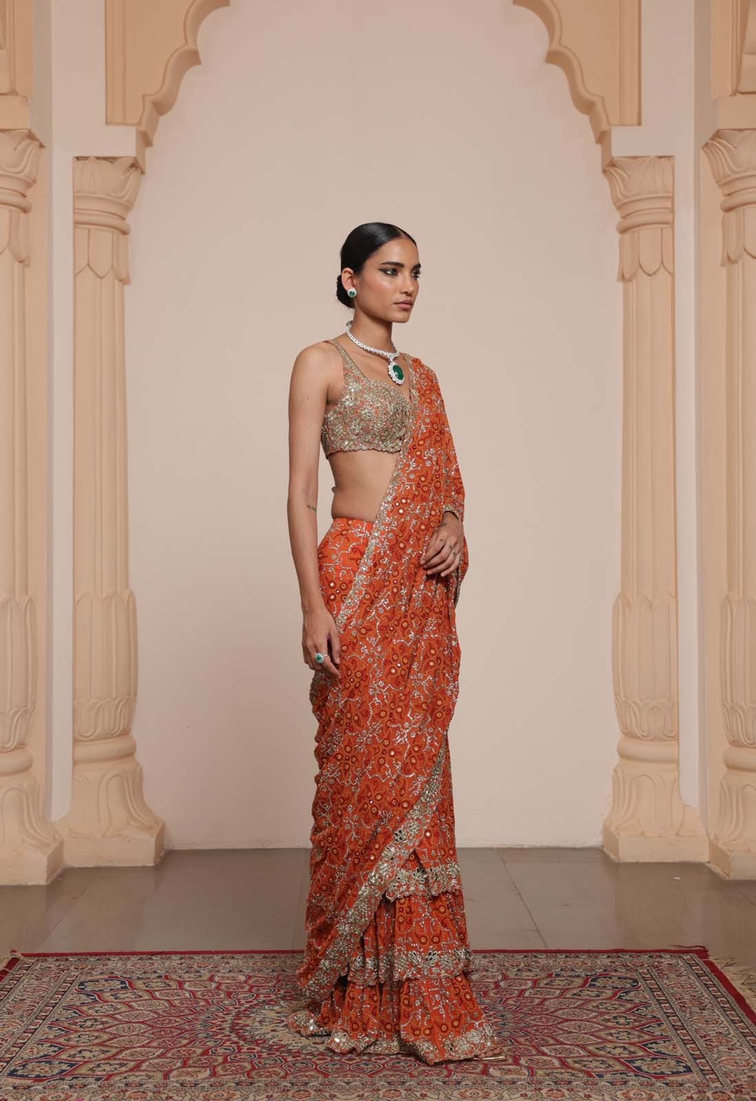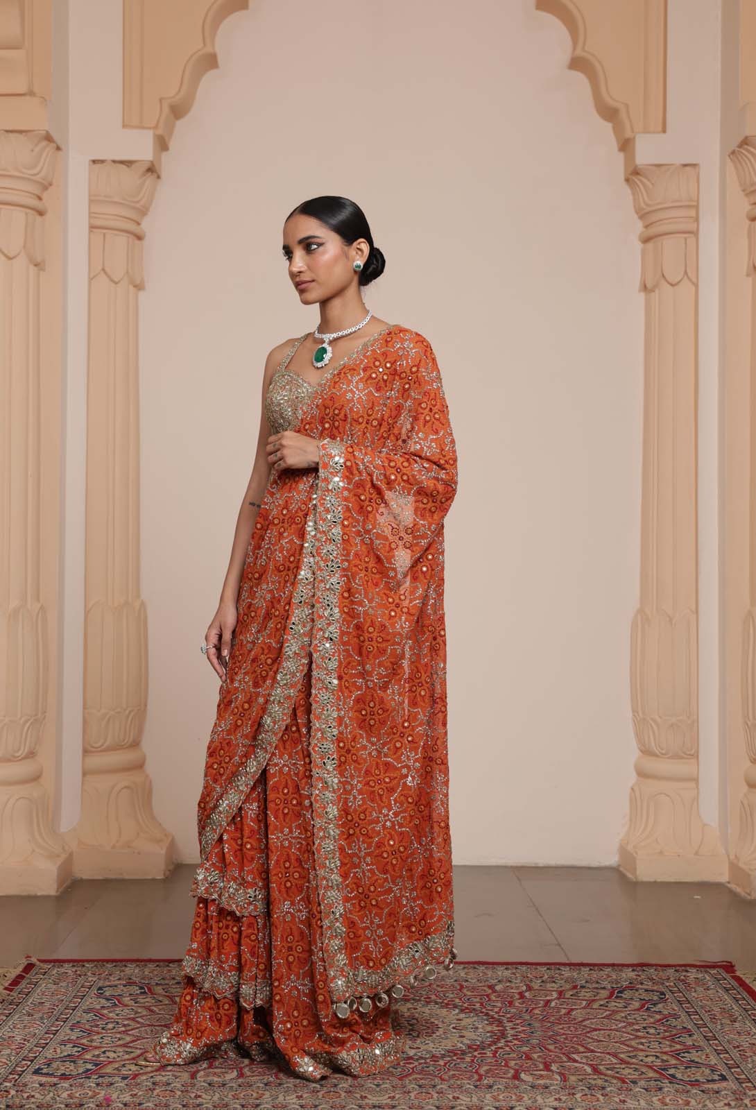 The sari is crafted in a warm toasted orange shade with rose gold accents, providing a radiant and festive appeal. Hand-applied mirror, cutdana, and sequin embroidery is arranged to create a visually striking and balanced aesthetic, perfect for wedding celebrations.