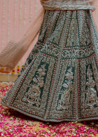 A stunning green raw silk ensemble featuring a sleeveless blouse with bold floral motifs and a floor-length lehenga adorned with geometric and floral patterns in stone, silver, and thread work—perfect for a regal bridal or festive look.
