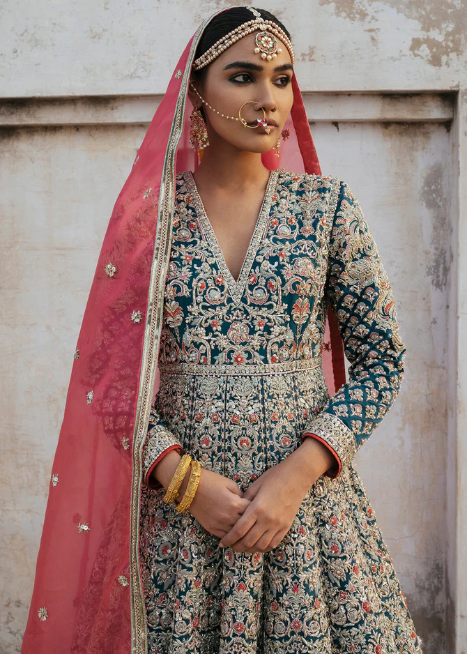 The top of this exquisite Alina Ashfaq bridal dress is designed as a flowing grey multi-layered gown, crafted from premium fabrics to provide a luxurious feel and graceful silhouette. The front, back, and sleeves are embellished with intricate hand embroidery, sequins, and delicate motifs, enhancing the gown’s regal appearance. Its design reflects contemporary bridal fashion, maintaining elegance while showcasing masterful craftsmanship.
