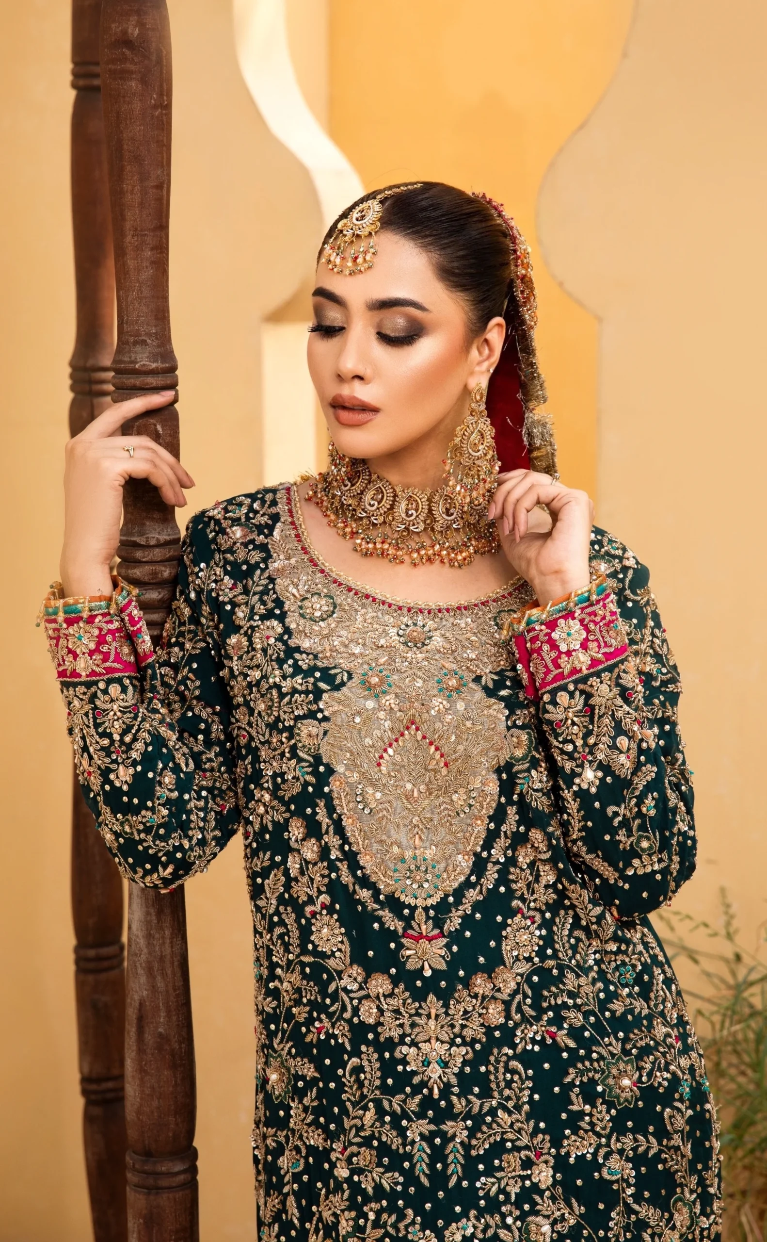 A rich emerald green base, elevated with contrasting pink accents and traditional metallic embroidery.
