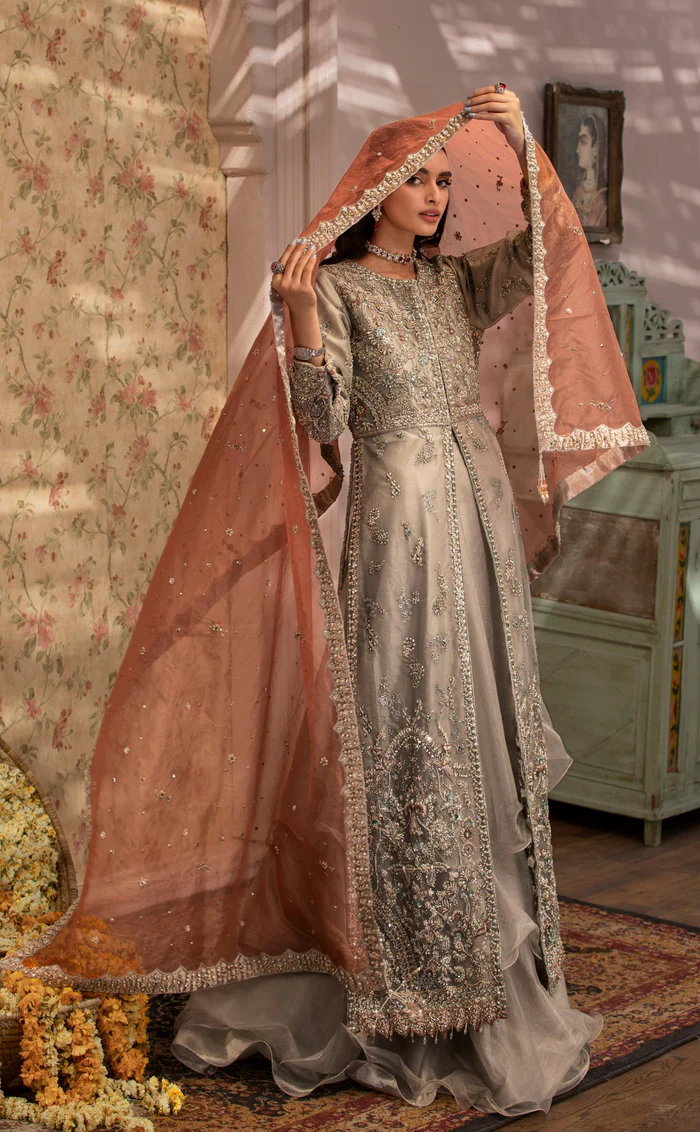 A refined steel grey organza jacket paired with a flowing skirt and a soft salmon peach dupatta, exquisitely hand-embroidered for an elegant balance of tradition and modern luxury.