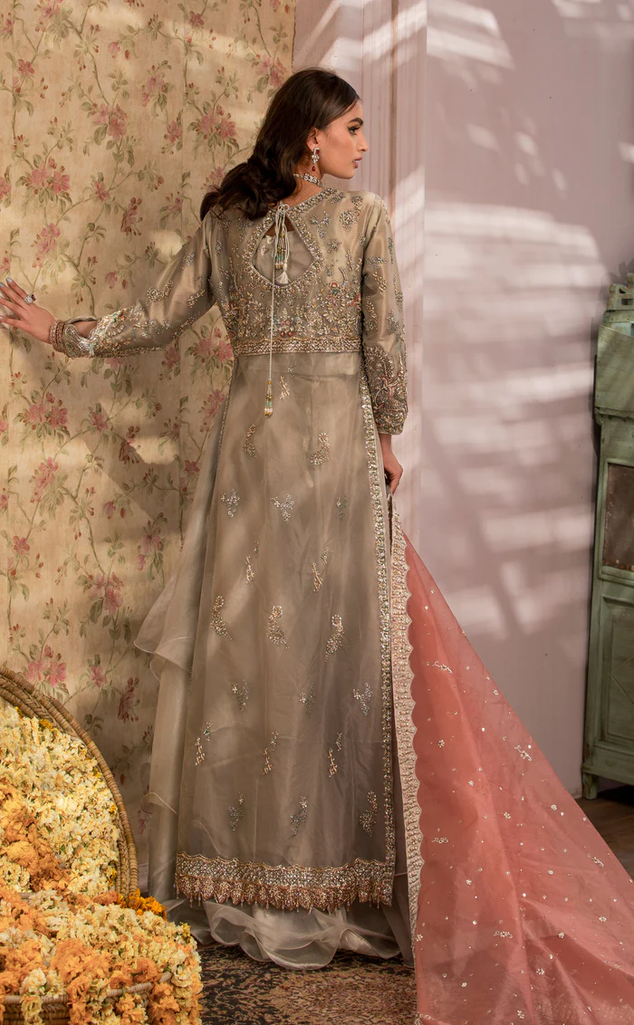 The jacket is tailored in luxurious steel grey organza, designed with a graceful elongated silhouette that exudes sophistication. It features a delicate tropical-inspired pattern, enriched with intricate hand embroidery executed using premium cora, dabka, pearls, and fine detailing. Subtle tassel accents add movement and charm, elevating the jacket into a statement piece suitable for formal and celebratory occasions.