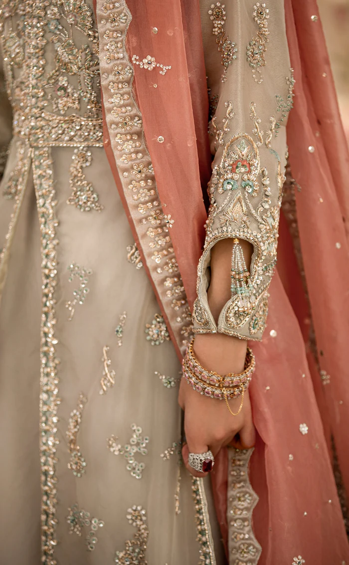 The ensemble is completed with a soft salmon peach organza dupatta that offers a striking yet graceful contrast to the steel grey base. It is adorned with delicate motif sprays and intricately detailed borders, finished with elegant tassels that add a touch of artisanal finesse.